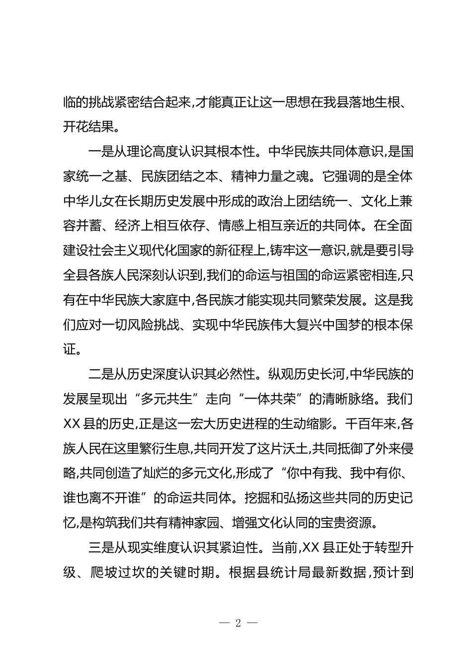 關(guān)于鑄牢中華民族共同體意識推動我縣經(jīng)濟(jì)社會高質(zhì)量發(fā)展的領(lǐng)學(xué)報告(精品)各位領(lǐng)導(dǎo)、同志們:大家好。根據(jù)縣委理論學(xué)習(xí)中心組的安排,今天由我圍繞“鑄牢中華民族共同體意識與我縣經(jīng)濟(jì)社會發(fā)展”這一主題,作一次領(lǐng)學(xué)發(fā)言。習(xí)近平總書記深刻指出,鑄牢中華民族共同體意識是新時代黨的民族工作的“綱”,所有工作要向此聚焦。2024年9月,總書記在全國民族團(tuán)結(jié)進(jìn)步表彰大會上的重要講話,再次強(qiáng)調(diào)要以此為主線,統(tǒng)籌推進(jìn)民族工作各項(xiàng)事業(yè)。這一重要論述,為我們這個多民族聚居的自治縣,指明了前進(jìn)方向、提供了根本遵循。今天,我將結(jié)合我縣實(shí)際,重點(diǎn)圍繞如何將這一“綱”領(lǐng)作用,轉(zhuǎn)化...