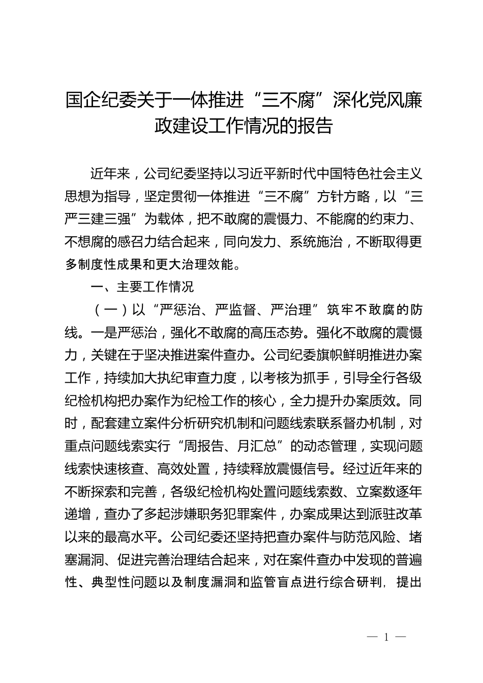 國企紀(jì)委關(guān)于一體推進(jìn)“三不腐”深化黨風(fēng)廉政建設(shè)工作情況的報(bào)告
