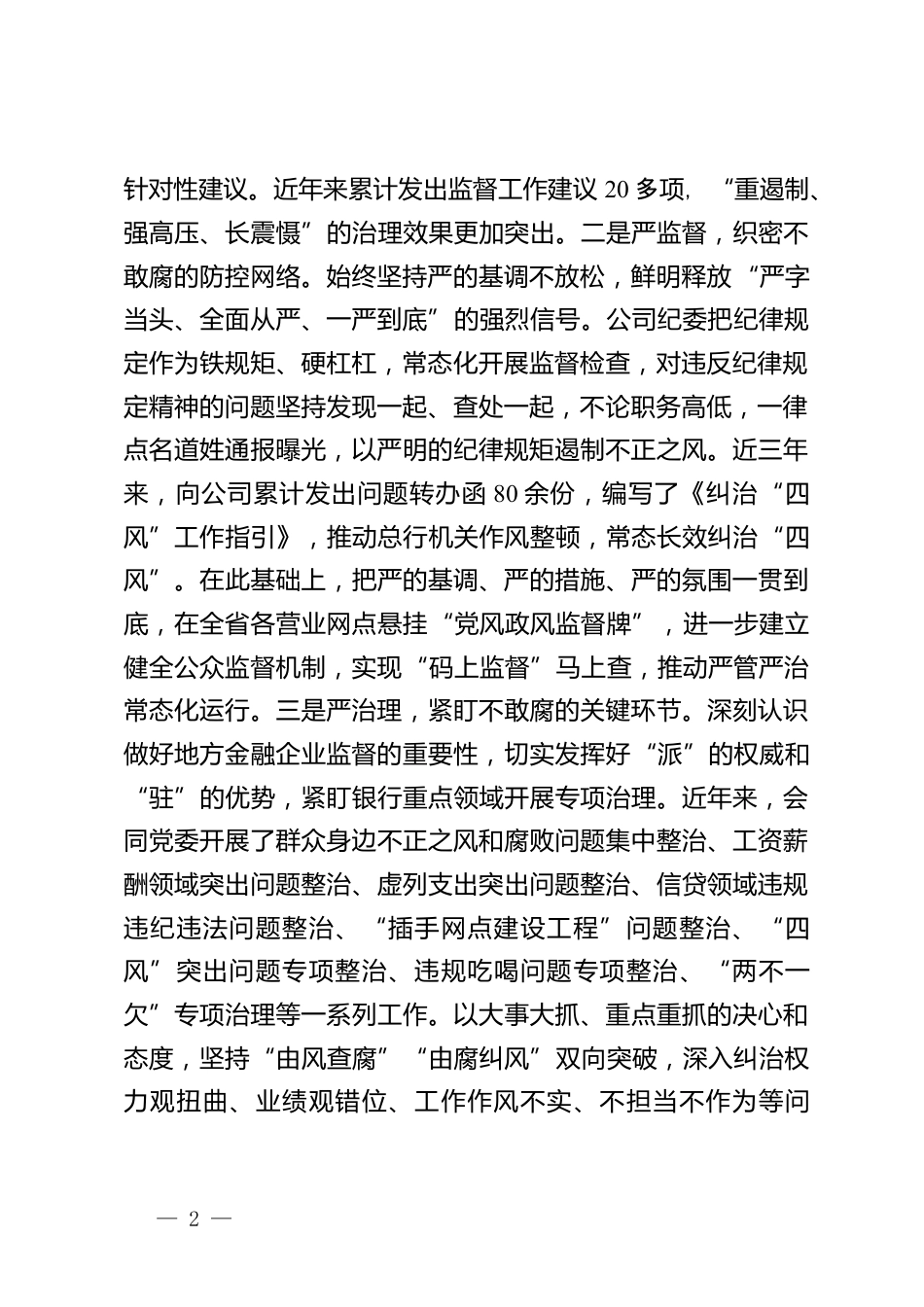 國企紀(jì)委關(guān)于一體推進(jìn)“三不腐”深化黨風(fēng)廉政建設(shè)工作情況的報(bào)告近年來,公司紀(jì)委堅(jiān)持以習(xí)近平新時(shí)代中國特色社會(huì)主義思想為指導(dǎo),堅(jiān)定貫徹一體推進(jìn)“三不腐”方針方略,以“三嚴(yán)三建三強(qiáng)”為載體,把不敢腐的震懾力、不能腐的約束力、不想腐的感召力結(jié)合起來,同向發(fā)力、系統(tǒng)施治,不斷取得更多制度性成果和更大治理效能。一、主要工作情況(一)以“嚴(yán)懲治、嚴(yán)監(jiān)督、嚴(yán)治理”筑牢不敢腐的防線。一是嚴(yán)懲治,強(qiáng)化不敢腐的高壓態(tài)勢。強(qiáng)化不敢腐的震懾力,關(guān)鍵在于堅(jiān)決推進(jìn)案件查辦。公司紀(jì)委旗幟鮮明推進(jìn)辦案工作,持續(xù)加大執(zhí)紀(jì)審查力度,以考核為抓手,引導(dǎo)全行各級(jí)紀(jì)檢...