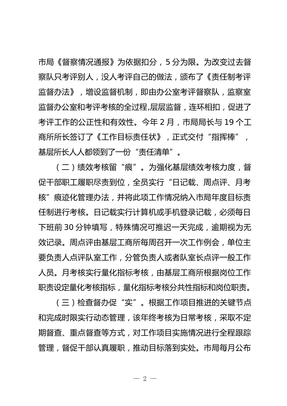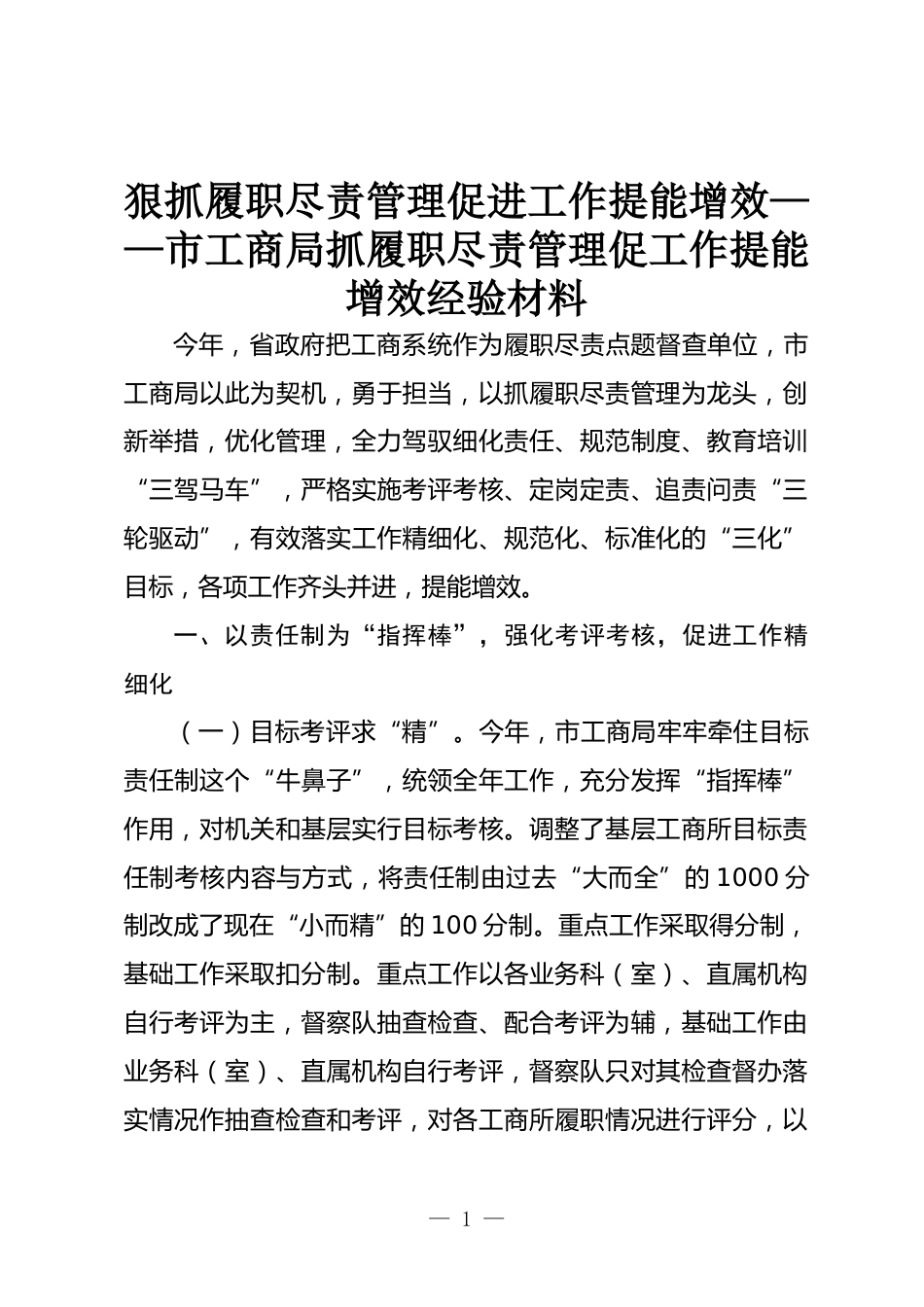 狠抓履職盡責(zé)管理促進(jìn)工作提能增效——市工商局抓履職盡責(zé)管理促工作提能增效經(jīng)驗(yàn)材料今年,省政府把工商系統(tǒng)作為履職盡責(zé)點(diǎn)題督查單位,市工商局以此為契機(jī),勇于擔(dān)當(dāng),以抓履職盡責(zé)管理為龍頭,創(chuàng)新舉措,優(yōu)化管理,全力駕馭細(xì)化責(zé)任、規(guī)范制度、教育培訓(xùn)“三駕馬車”,嚴(yán)格實(shí)施考評(píng)考核、定崗定責(zé)、追責(zé)問(wèn)責(zé)“三輪驅(qū)動(dòng)”,有效落實(shí)工作精細(xì)化、規(guī)范化、標(biāo)準(zhǔn)化的“三化”目標(biāo),各項(xiàng)工作齊頭并進(jìn),提能增效。一、以責(zé)任制為“指揮棒”,強(qiáng)化考評(píng)考核,促進(jìn)工作精細(xì)化(一)目標(biāo)考評(píng)求“精”。今年,市工商局牢牢牽住目標(biāo)責(zé)任制這個(gè)“牛鼻子”,統(tǒng)領(lǐng)全年工作,充分發(fā)揮“...