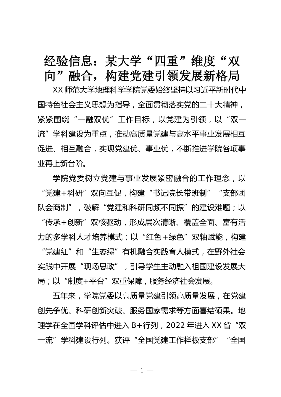 經(jīng)驗(yàn)信息:某大學(xué)“四重”維度“雙向”融合,構(gòu)建黨建引領(lǐng)發(fā)展新格局