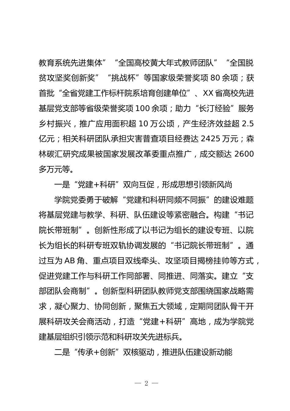 經(jīng)驗(yàn)信息:某大學(xué)“四重”維度“雙向”融合,構(gòu)建黨建引領(lǐng)發(fā)展新格局XX師范大學(xué)地理科學(xué)學(xué)院黨委始終堅(jiān)持以習(xí)近平新時(shí)代中國(guó)特色社會(huì)主義思想為指導(dǎo),全面貫徹落實(shí)黨的二十大精神,緊緊圍繞“一融雙優(yōu)”工作目標(biāo),以黨建為引領(lǐng),以“雙一流”學(xué)科建設(shè)為重點(diǎn),推動(dòng)高質(zhì)量黨建與高水平事業(yè)發(fā)展相互促進(jìn)、相互融合,實(shí)現(xiàn)黨建優(yōu)、事業(yè)優(yōu),不斷推進(jìn)學(xué)院各項(xiàng)事業(yè)再上新臺(tái)階。學(xué)院黨委樹(shù)立黨建與事業(yè)發(fā)展緊密融合的工作理念,以“黨建+科研”雙向互促,構(gòu)建“書(shū)記院長(zhǎng)帶班制”“支部團(tuán)隊(duì)會(huì)商制”,破解“黨建和科研同頻不同振”的建設(shè)難題;以“傳承+創(chuàng)新”雙核驅(qū)動(dòng),形成層次清...