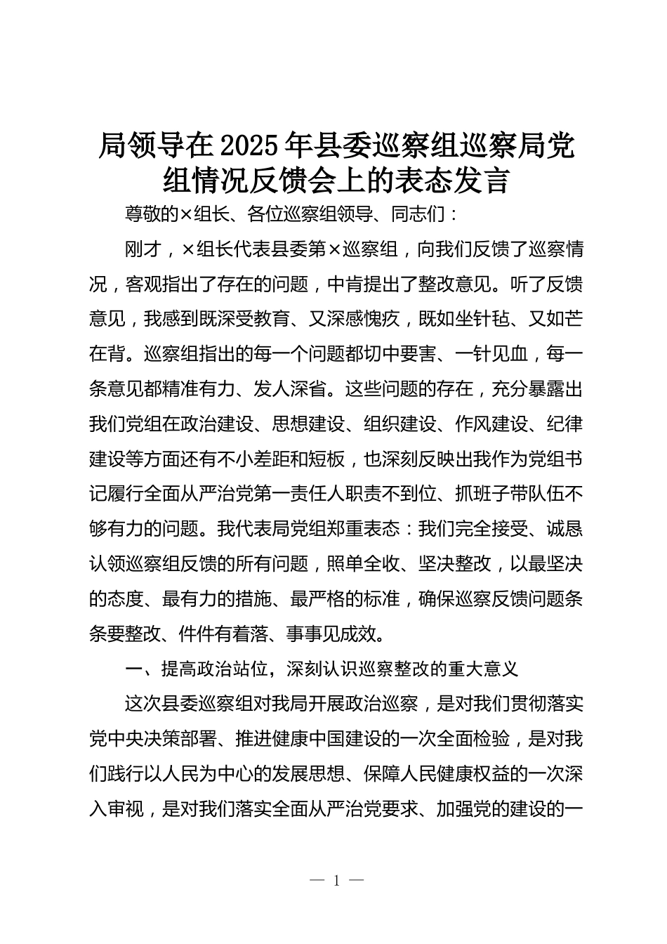 局領(lǐng)導(dǎo)在2025年縣委巡察組巡察局黨組情況反饋會上的表態(tài)發(fā)言