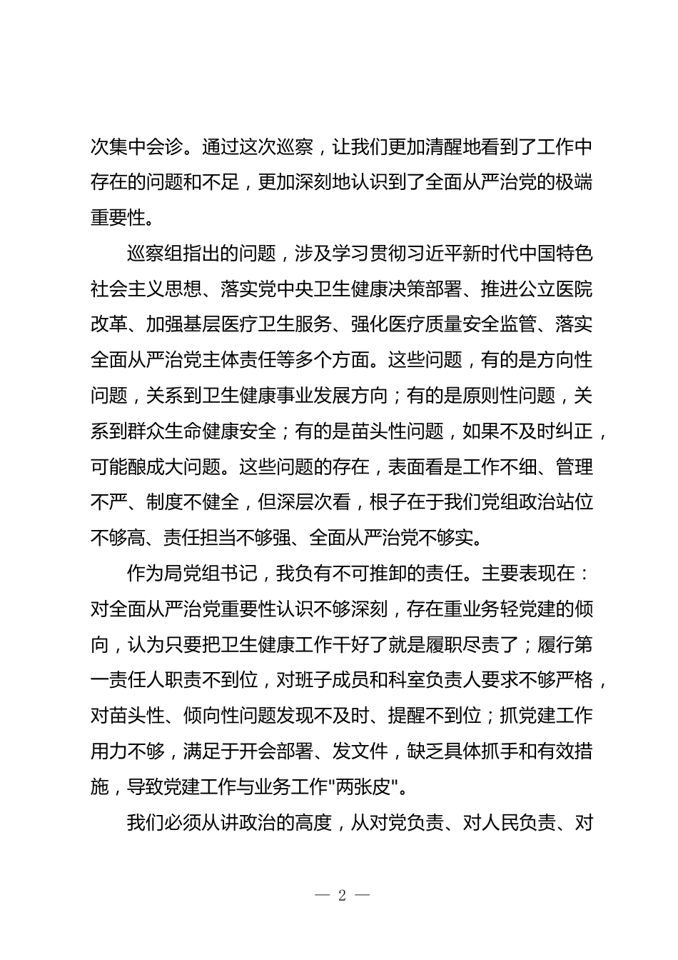 局領(lǐng)導(dǎo)在2025年縣委巡察組巡察局黨組情況反饋會上的表態(tài)發(fā)言尊敬的×組長、各位巡察組領(lǐng)導(dǎo)、同志們:剛才,×組長代表縣委第×巡察組,向我們反饋了巡察情況,客觀指出了存在的問題,中肯提出了整改意見。聽了反饋意見,我感到既深受教育、又深感愧疚,既如坐針氈、又如芒在背。巡察組指出的每一個問題都切中要害、一針見血,每一條意見都精準(zhǔn)有力、發(fā)人深省。這些問題的存在,充分暴露出我們黨組在政治建設(shè)、思想建設(shè)、組織建設(shè)、作風(fēng)建設(shè)、紀(jì)律建設(shè)等方面還有不小差距和短板,也深刻反映出我作為黨組書記履行全面從嚴(yán)治黨第一責(zé)任人職責(zé)不到位、抓班子帶隊伍不夠有力的...