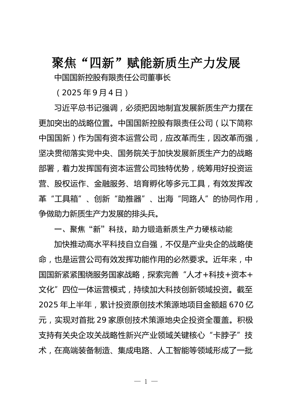 聚焦“四新”賦能新質(zhì)生產(chǎn)力發(fā)展中國國新控股有限責任公司董事長(2025年9月4日)習近平總書記強調(diào),必須把因地制宜發(fā)展新質(zhì)生產(chǎn)力擺在更加突出的戰(zhàn)略位置。中國國新控股有限責任公司(以下簡稱中國國新)作為國有資本運營公司,應改革而生,因改革而強,堅決貫徹落實黨中央、國務院關于加快發(fā)展新質(zhì)生產(chǎn)力的戰(zhàn)略部署,著力發(fā)揮國有資本運營公司獨特優(yōu)勢,統(tǒng)籌用好投資運營、股權運作、金融服務、培育孵化等多元工具,有效發(fā)揮改革“工具箱”、創(chuàng)新“助推器”、出海“同路人”的協(xié)同作用,爭做助力新質(zhì)生產(chǎn)力發(fā)展的排頭兵。一、聚焦“新”科技,助力鍛造新質(zhì)生產(chǎn)力硬核動...