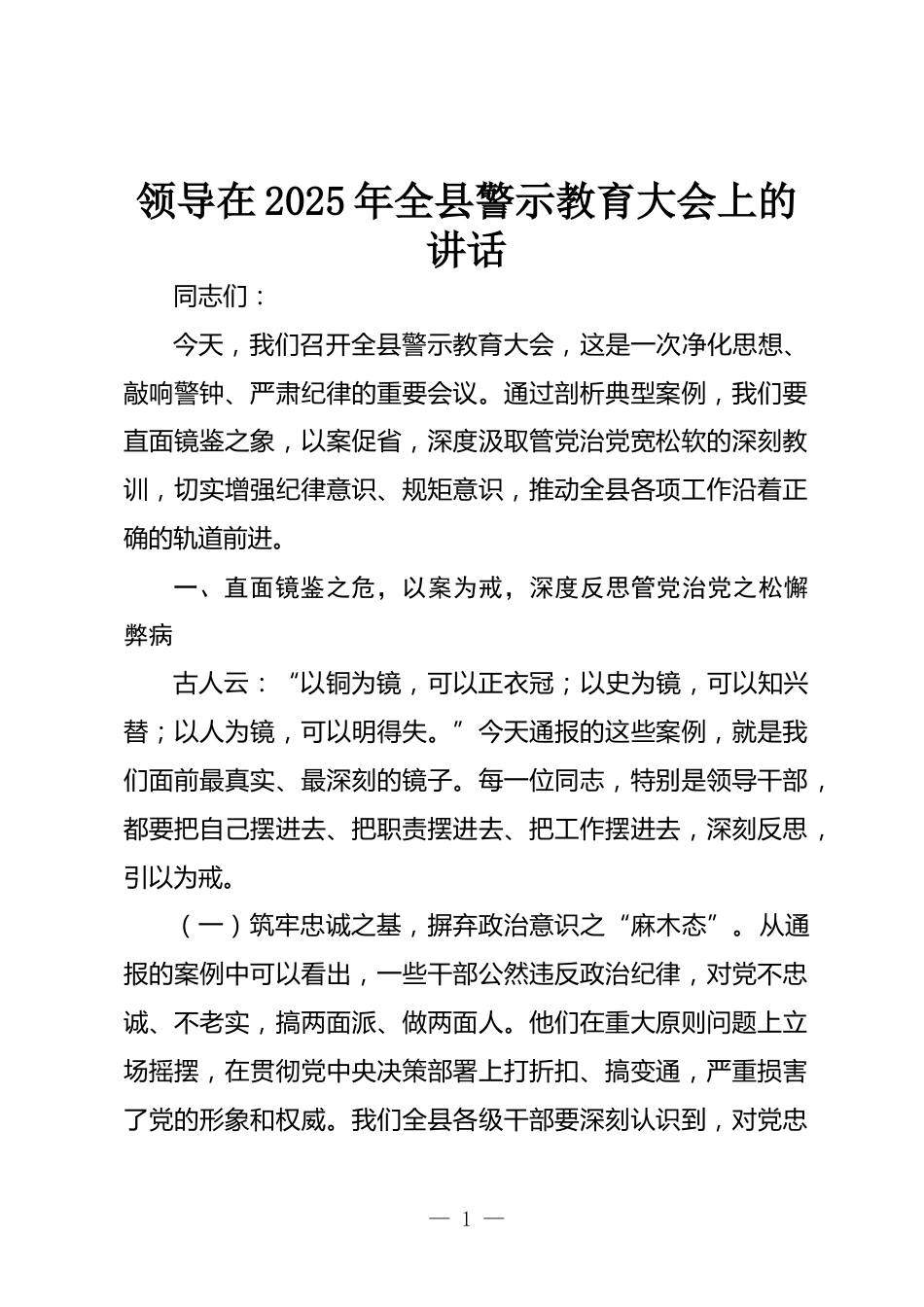 領(lǐng)導(dǎo)在2025年全縣警示教育大會(huì)上的講話同志們:今天,我們召開(kāi)全縣警示教育大會(huì),這是一次凈化思想、敲響警鐘、嚴(yán)肅紀(jì)律的重要會(huì)議。通過(guò)剖析典型案例,我們要直面鏡鑒之象,以案促省,深度汲取管黨治黨寬松軟的深刻教訓(xùn),切實(shí)增強(qiáng)紀(jì)律意識(shí)、規(guī)矩意識(shí),推動(dòng)全縣各項(xiàng)工作沿著正確的軌道前進(jìn)。一、直面鏡鑒之危,以案為戒,深度反思管黨治黨之松懈弊病古人云:“以銅為鏡,可以正衣冠;以史為鏡,可以知興替;以人為鏡,可以明得失?!苯裉焱▓?bào)的這些案例,就是我們面前最真實(shí)、最深刻的鏡子。每一位同志,特別是領(lǐng)導(dǎo)干部,都要把自己擺進(jìn)去、把職責(zé)擺進(jìn)去、把工作擺進(jìn)去,...