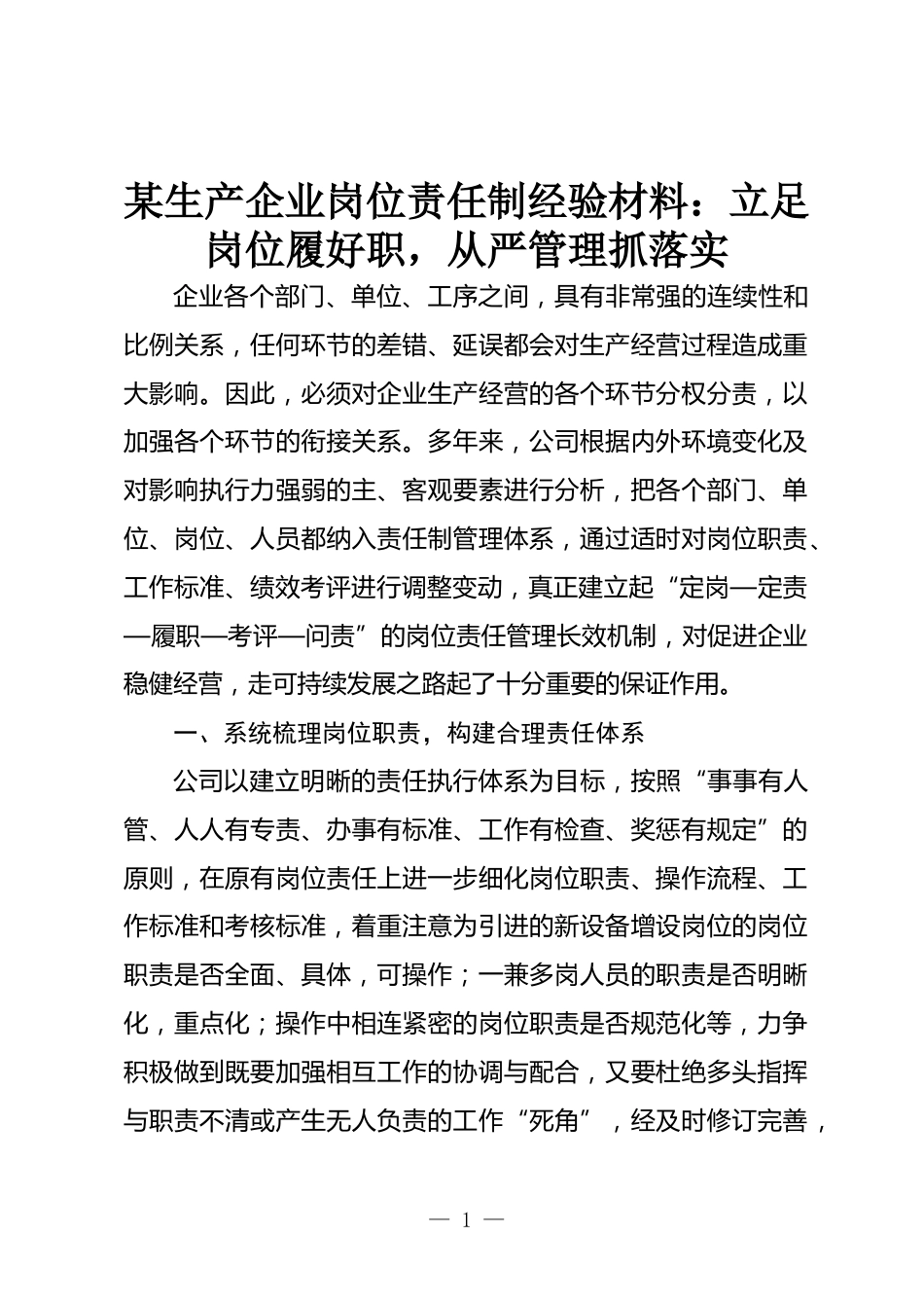 某生產(chǎn)企業(yè)崗位責(zé)任制經(jīng)驗材料:立足崗位履好職,從嚴(yán)管理抓落實