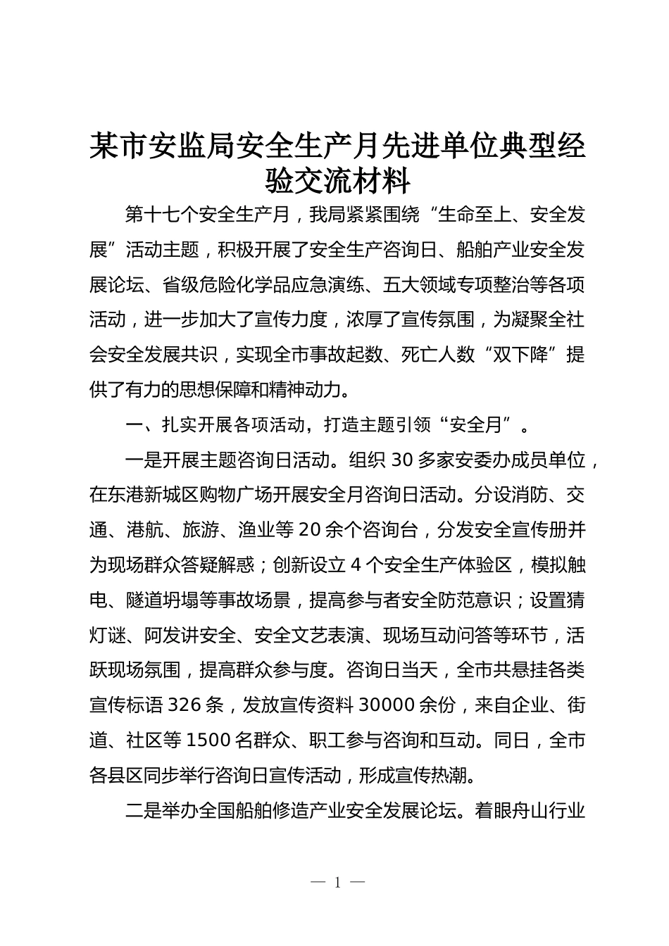 某市安監(jiān)局安全生產(chǎn)月先進(jìn)單位典型經(jīng)驗(yàn)交流材料第十七個(gè)安全生產(chǎn)月,我局緊緊圍繞“生命至上、安全發(fā)展”活動(dòng)主題,積極開展了安全生產(chǎn)咨詢?nèi)?、船舶產(chǎn)業(yè)安全發(fā)展論壇、省級(jí)危險(xiǎn)化學(xué)品應(yīng)急演練、五大領(lǐng)域?qū)m?xiàng)整治等各項(xiàng)活動(dòng),進(jìn)一步加大了宣傳力度,濃厚了宣傳氛圍,為凝聚全社會(huì)安全發(fā)展共識(shí),實(shí)現(xiàn)全市事故起數(shù)、死亡人數(shù)“雙下降”提供了有力的思想保障和精神動(dòng)力。一、扎實(shí)開展各項(xiàng)活動(dòng),打造主題引領(lǐng)“安全月”。一是開展主題咨詢?nèi)栈顒?dòng)。組織30多家安委辦成員單位,在東港新城區(qū)購(gòu)物廣場(chǎng)開展安全月咨詢?nèi)栈顒?dòng)。分設(shè)消防、交通、港航、旅游、漁業(yè)等20余個(gè)咨詢臺(tái),分發(fā)...