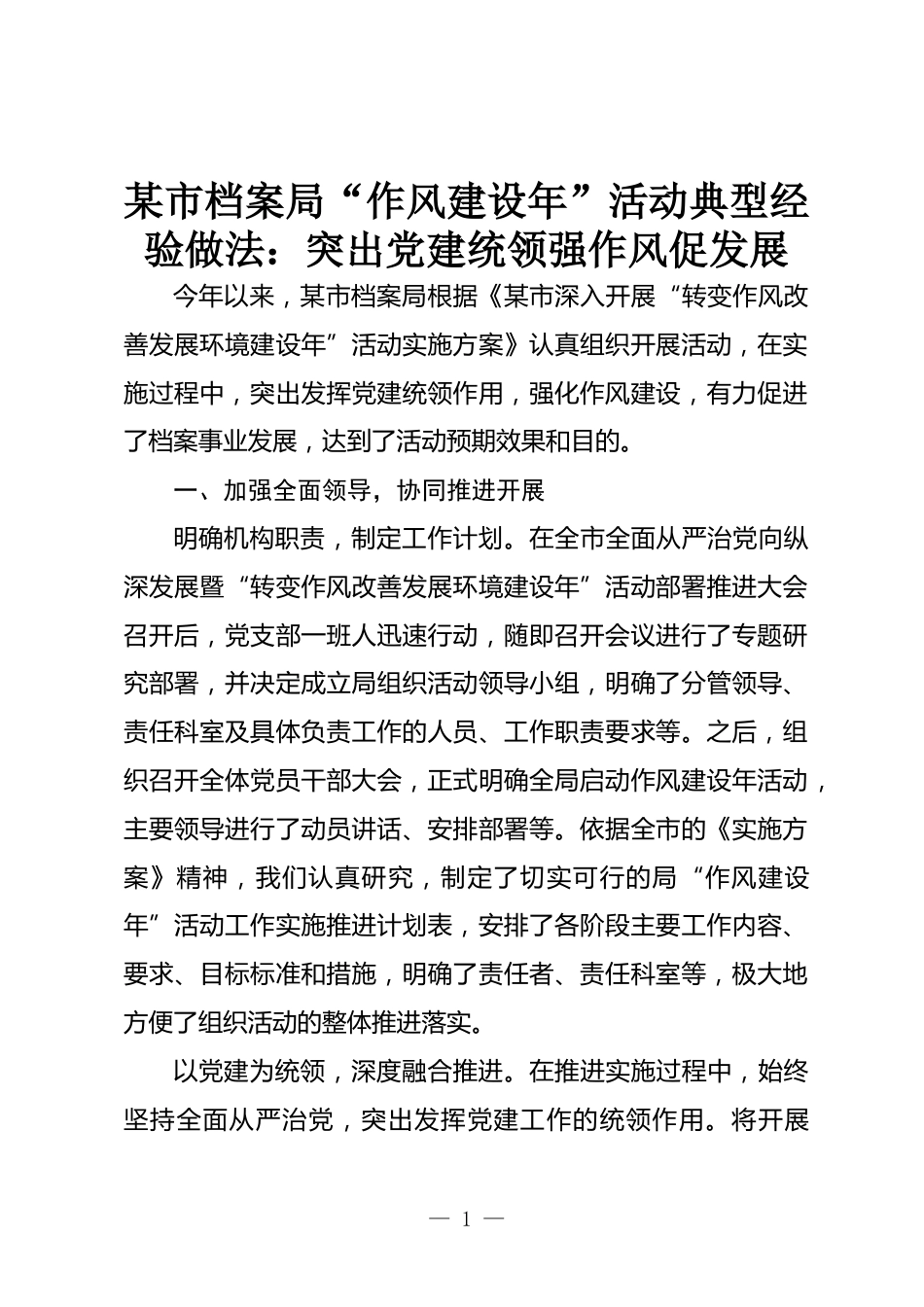 某市檔案局“作風(fēng)建設(shè)年”活動(dòng)典型經(jīng)驗(yàn)做法:突出黨建統(tǒng)領(lǐng)強(qiáng)作風(fēng)促發(fā)展今年以來,某市檔案局根據(jù)《某市深入開展“轉(zhuǎn)變作風(fēng)改善發(fā)展環(huán)境建設(shè)年”活動(dòng)實(shí)施方案》認(rèn)真組織開展活動(dòng),在實(shí)施過程中,突出發(fā)揮黨建統(tǒng)領(lǐng)作用,強(qiáng)化作風(fēng)建設(shè),有力促進(jìn)了檔案事業(yè)發(fā)展,達(dá)到了活動(dòng)預(yù)期效果和目的。一、加強(qiáng)全面領(lǐng)導(dǎo),協(xié)同推進(jìn)開展明確機(jī)構(gòu)職責(zé),制定工作計(jì)劃。在全市全面從嚴(yán)治黨向縱深發(fā)展暨“轉(zhuǎn)變作風(fēng)改善發(fā)展環(huán)境建設(shè)年”活動(dòng)部署推進(jìn)大會召開后,黨支部一班人迅速行動(dòng),隨即召開會議進(jìn)行了專題研究部署,并決定成立局組織活動(dòng)領(lǐng)導(dǎo)小組,明確了分管領(lǐng)導(dǎo)、責(zé)任科室及具體負(fù)責(zé)工作...