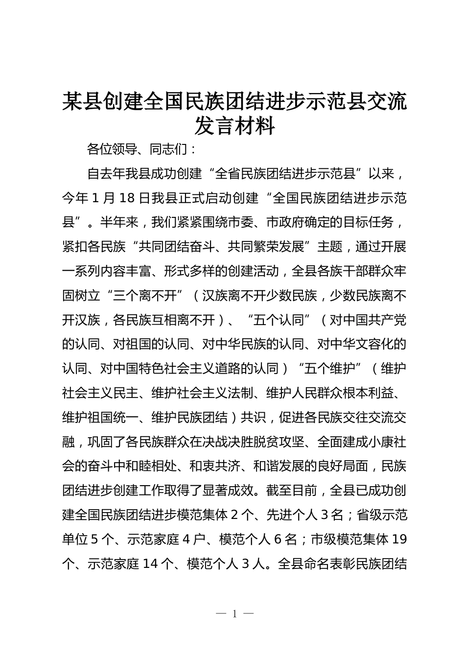 某縣創(chuàng)建全國(guó)民族團(tuán)結(jié)進(jìn)步示范縣交流發(fā)言材料各位領(lǐng)導(dǎo)、同志們:自去年我縣成功創(chuàng)建“全省民族團(tuán)結(jié)進(jìn)步示范縣”以來(lái),今年1月18日我縣正式啟動(dòng)創(chuàng)建“全國(guó)民族團(tuán)結(jié)進(jìn)步示范縣”。半年來(lái),我們緊緊圍繞市委、市政府確定的目標(biāo)任務(wù),緊扣各民族“共同團(tuán)結(jié)奮斗、共同繁榮發(fā)展”主題,通過(guò)開(kāi)展一系列內(nèi)容豐富、形式多樣的創(chuàng)建活動(dòng),全縣各族干部群眾牢固樹(shù)立“三個(gè)離不開(kāi)”(漢族離不開(kāi)少數(shù)民族,少數(shù)民族離不開(kāi)漢族,各民族互相離不開(kāi))、“五個(gè)認(rèn)同”(對(duì)中國(guó)共產(chǎn)黨的認(rèn)同、對(duì)祖國(guó)的認(rèn)同、對(duì)中華民族的認(rèn)同、對(duì)中華文容化的認(rèn)同、對(duì)中國(guó)特色社會(huì)主義道路的認(rèn)同)“五個(gè)維護(hù)...