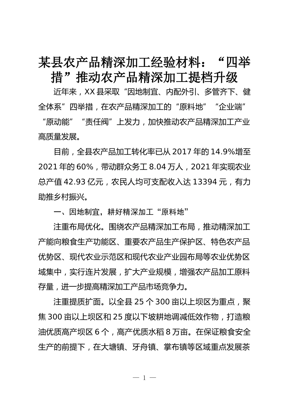 某縣農(nóng)產(chǎn)品精深加工經(jīng)驗(yàn)材料:“四舉措”推動(dòng)農(nóng)產(chǎn)品精深加工提檔升級(jí)近年來(lái),XX縣采取“因地制宜、內(nèi)配外引、多管齊下、健全體系”四舉措,在農(nóng)產(chǎn)品精深加工的“原料地”“企業(yè)端”“原動(dòng)能”“責(zé)任閥”上發(fā)力,加快推動(dòng)農(nóng)產(chǎn)品精深加工產(chǎn)業(yè)高質(zhì)量發(fā)展。目前,全縣農(nóng)產(chǎn)品加工轉(zhuǎn)化率已從2017年的14.9%增至2021年的60%,帶動(dòng)群眾務(wù)工8.04萬(wàn)人,2021年實(shí)現(xiàn)農(nóng)業(yè)總產(chǎn)值42.93億元,農(nóng)民人均可支配收入達(dá)13394元,有力助推鄉(xiāng)村振興。一、因地制宜,耕好精深加工“原料地”注重布局優(yōu)化。圍繞農(nóng)產(chǎn)品精深加工布局,推動(dòng)精深加工產(chǎn)能向糧食生產(chǎn)功能區(qū)、重要農(nóng)產(chǎn)品生產(chǎn)保護(hù)區(qū)、特色農(nóng)...