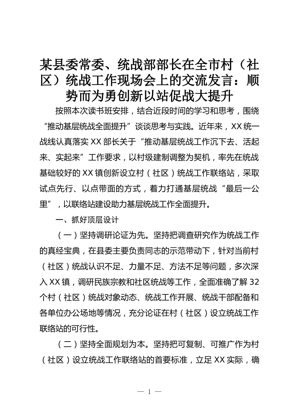 某縣委常委、統(tǒng)戰(zhàn)部部長(zhǎng)在全市村(社區(qū))統(tǒng)戰(zhàn)工作現(xiàn)場(chǎng)會(huì)上的交流發(fā)言:順勢(shì)而為勇創(chuàng)新 以站促戰(zhàn)大提升