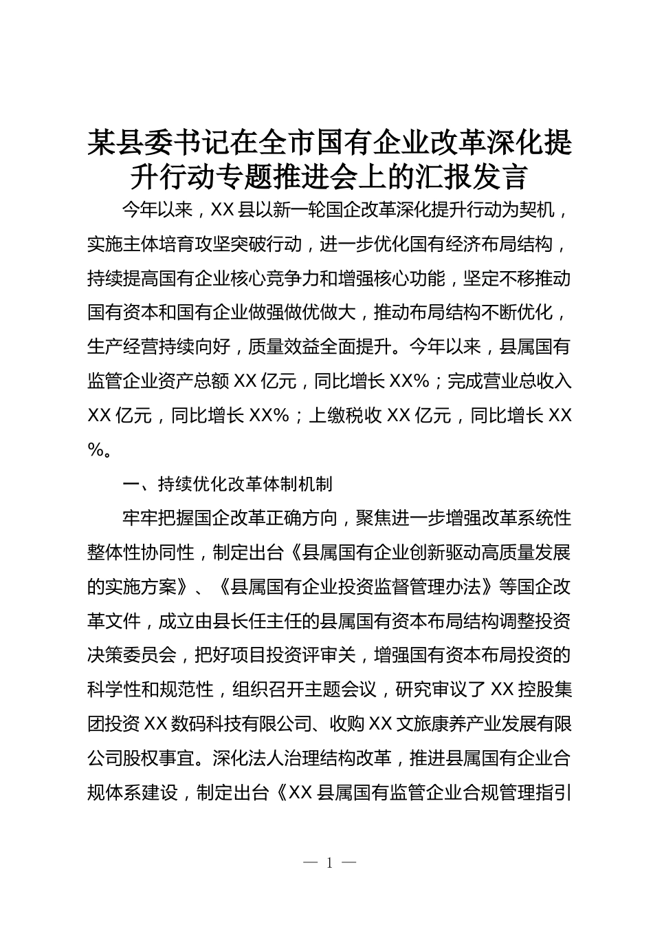 某縣委書記在全市國(guó)有企業(yè)改革深化提升行動(dòng)專題推進(jìn)會(huì)上的匯報(bào)發(fā)言今年以來(lái),XX縣以新一輪國(guó)企改革深化提升行動(dòng)為契機(jī),實(shí)施主體培育攻堅(jiān)突破行動(dòng),進(jìn)一步優(yōu)化國(guó)有經(jīng)濟(jì)布局結(jié)構(gòu),持續(xù)提高國(guó)有企業(yè)核心競(jìng)爭(zhēng)力和增強(qiáng)核心功能,堅(jiān)定不移推動(dòng)國(guó)有資本和國(guó)有企業(yè)做強(qiáng)做優(yōu)做大,推動(dòng)布局結(jié)構(gòu)不斷優(yōu)化,生產(chǎn)經(jīng)營(yíng)持續(xù)向好,質(zhì)量效益全面提升。今年以來(lái),縣屬國(guó)有監(jiān)管企業(yè)資產(chǎn)總額XX億元,同比增長(zhǎng)XX%;完成營(yíng)業(yè)總收入XX億元,同比增長(zhǎng)XX%;上繳稅收XX億元,同比增長(zhǎng)XX%。一、持續(xù)優(yōu)化改革體制機(jī)制牢牢把握國(guó)企改革正確方向,聚焦進(jìn)一步增強(qiáng)改革系統(tǒng)性整體性協(xié)同性,制定出臺(tái)《縣...