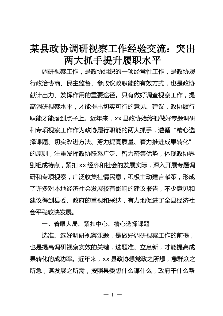某縣政協(xié)調(diào)研視察工作經(jīng)驗交流:突出兩大抓手提升履職水平調(diào)研視察工作,是政協(xié)組織的一項經(jīng)常性工作,是政協(xié)履行政治協(xié)商、民主監(jiān)督、參政議政職能的有效方式,也是政協(xié)獻計出力、發(fā)揮作用的重要途徑。只有做好調(diào)查視察工作,提高調(diào)研視察水平,才能提出切實可行的意見、建議,政協(xié)履行職能才能落到點子上。近年來,xx縣政協(xié)始終把做好專題調(diào)研和專項視察工作作為政協(xié)履行職能的兩大抓手,遵循“精心選擇課題、切實改進方法、努力提高質(zhì)量、著力推進成果轉(zhuǎn)化”的原則,注重發(fā)揮政協(xié)聯(lián)系廣泛、智力密集優(yōu)勢,體現(xiàn)政協(xié)界別組成特點,緊扣xx經(jīng)濟和社會的發(fā)展實際,深入開展...