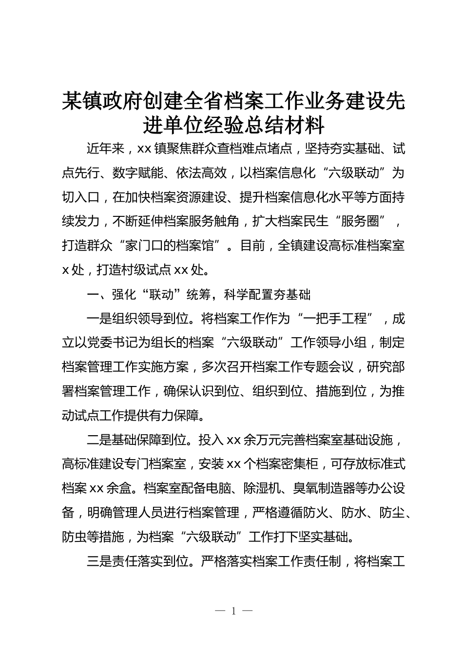某鎮(zhèn)政府創(chuàng)建全省檔案工作業(yè)務(wù)建設(shè)先進(jìn)單位經(jīng)驗(yàn)總結(jié)材料