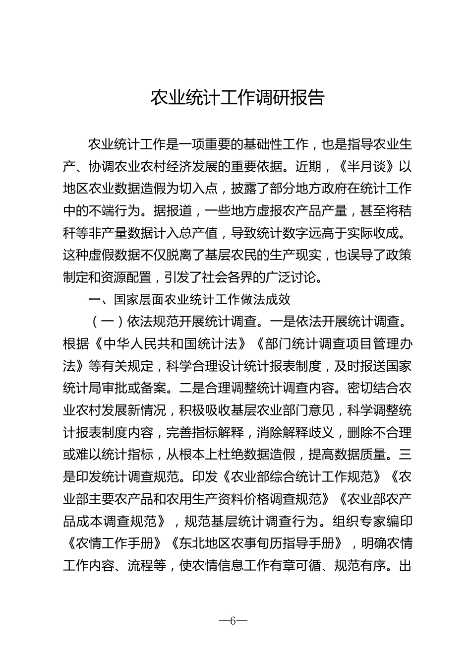 農(nóng)業(yè)統(tǒng)計工作調(diào)研報告農(nóng)業(yè)統(tǒng)計工作是一項重要的基礎(chǔ)性工作,也是指導(dǎo)農(nóng)業(yè)生產(chǎn)、協(xié)調(diào)農(nóng)業(yè)農(nóng)村經(jīng)濟(jì)發(fā)展的重要依據(jù)。近期,《半月談》以地區(qū)農(nóng)業(yè)數(shù)據(jù)造假為切入點,披露了部分地方政府在統(tǒng)計工作中的不端行為。據(jù)報道,一些地方虛報農(nóng)產(chǎn)品產(chǎn)量,甚至將秸稈等非產(chǎn)量數(shù)據(jù)計入總產(chǎn)值,導(dǎo)致統(tǒng)計數(shù)字遠(yuǎn)高于實際收成。這種虛假數(shù)據(jù)不僅脫離了基層農(nóng)民的生產(chǎn)現(xiàn)實,也誤導(dǎo)了政策制定和資源配置,引發(fā)了社會各界的廣泛討論。一、國家層面農(nóng)業(yè)統(tǒng)計工作做法成效(一)依法規(guī)范開展統(tǒng)計調(diào)查。一是依法開展統(tǒng)計調(diào)查。根據(jù)《中華人民共和國統(tǒng)計法》《部門統(tǒng)計調(diào)查項目管理辦法》等有關(guān)規(guī)定...