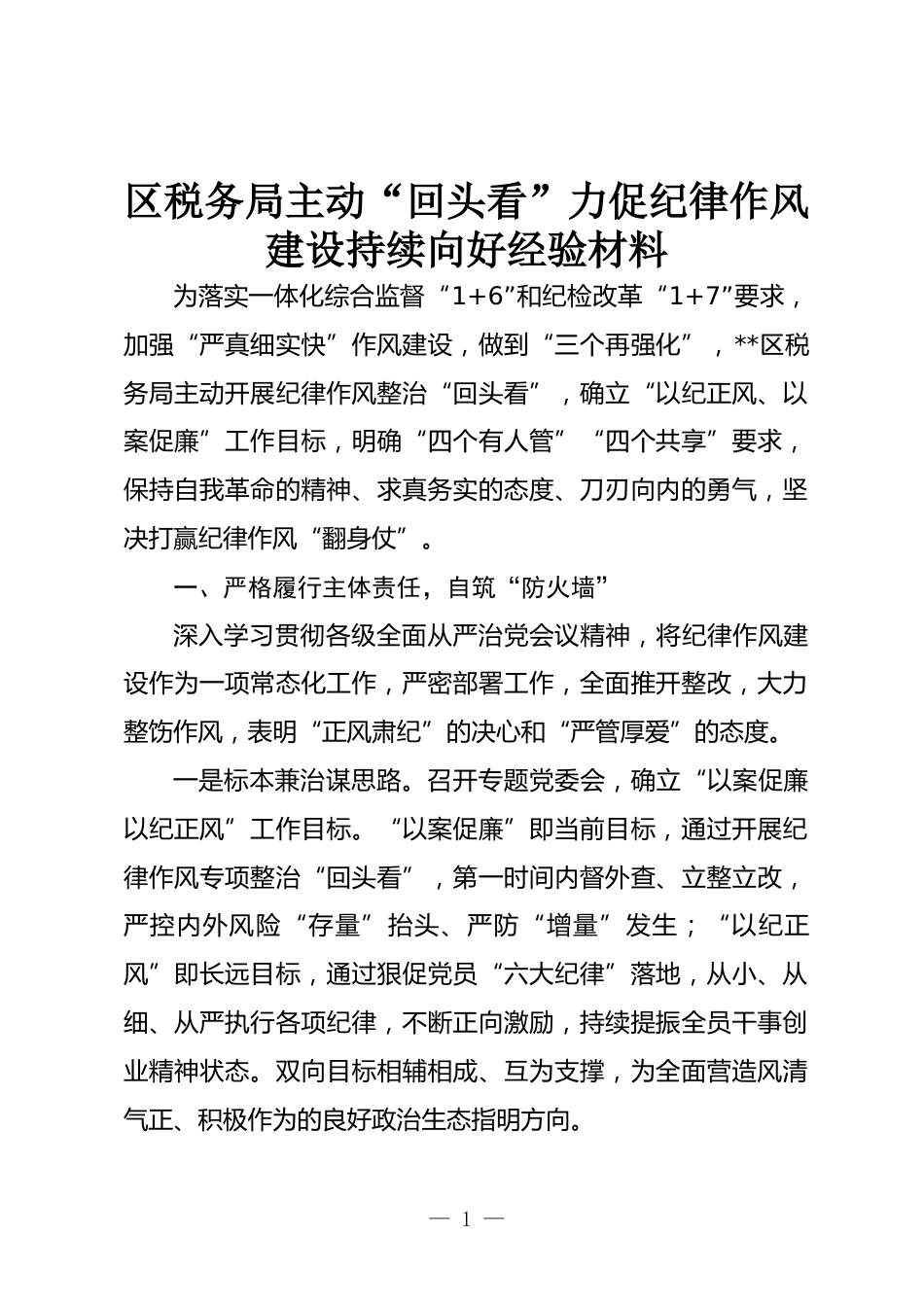 區(qū)稅務(wù)局主動“回頭看”力促紀(jì)律作風(fēng)建設(shè)持續(xù)向好經(jīng)驗材料