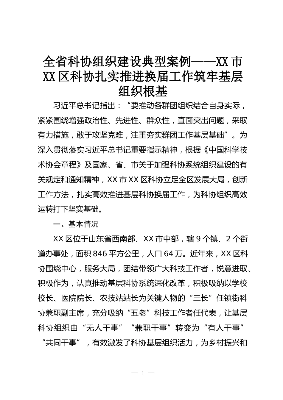全省科協(xié)組織建設(shè)典型案例——XX市XX區(qū)科協(xié)扎實(shí)推進(jìn)換屆工作筑牢基層組織根基習(xí)近平總書記指出:“要推動(dòng)各群團(tuán)組織結(jié)合自身實(shí)際,緊緊圍繞增強(qiáng)政治性、先進(jìn)性、群眾性,直面突出問題,采取有力措施,敢于攻堅(jiān)克難,注重夯實(shí)群團(tuán)工作基層基礎(chǔ)”。為深入貫徹落實(shí)習(xí)近平總書記重要指示精神,根據(jù)《中國科學(xué)技術(shù)協(xié)會(huì)章程》及國家、省、市關(guān)于加強(qiáng)科協(xié)系統(tǒng)組織建設(shè)的有關(guān)規(guī)定和通知精神,XX市XX區(qū)科協(xié)立足全區(qū)發(fā)展大局,創(chuàng)新工作方法,扎實(shí)高效推進(jìn)基層科協(xié)換屆工作,為科協(xié)組織高效運(yùn)轉(zhuǎn)打下堅(jiān)實(shí)基礎(chǔ)。一、基本情況XX區(qū)位于山東省西南部、XX市中部,轄9個(gè)鎮(zhèn)、2個(gè)街道辦事處,...