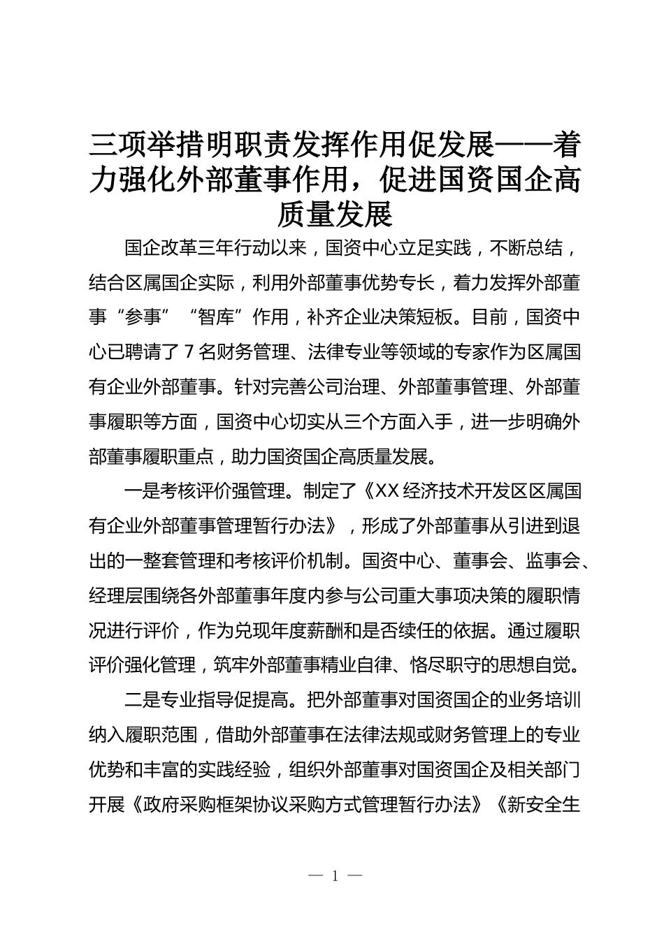 三項舉措明職責發(fā)揮作用促發(fā)展——著力強化外部董事作用,促進國資國企高質(zhì)量發(fā)展國企改革三年行動以來,國資中心立足實踐,不斷總結(jié),結(jié)合區(qū)屬國企實際,利用外部董事優(yōu)勢專長,著力發(fā)揮外部董事“參事”“智庫”作用,補齊企業(yè)決策短板。目前,國資中心已聘請了7名財務(wù)管理、法律專業(yè)等領(lǐng)域的專家作為區(qū)屬國有企業(yè)外部董事。針對完善公司治理、外部董事管理、外部董事履職等方面,國資中心切實從三個方面入手,進一步明確外部董事履職重點,助力國資國企高質(zhì)量發(fā)展。一是考核評價強管理。制定了《XX經(jīng)濟技術(shù)開發(fā)區(qū)區(qū)屬國有企業(yè)外部董事管理暫行辦法》,形成了外部董事...
