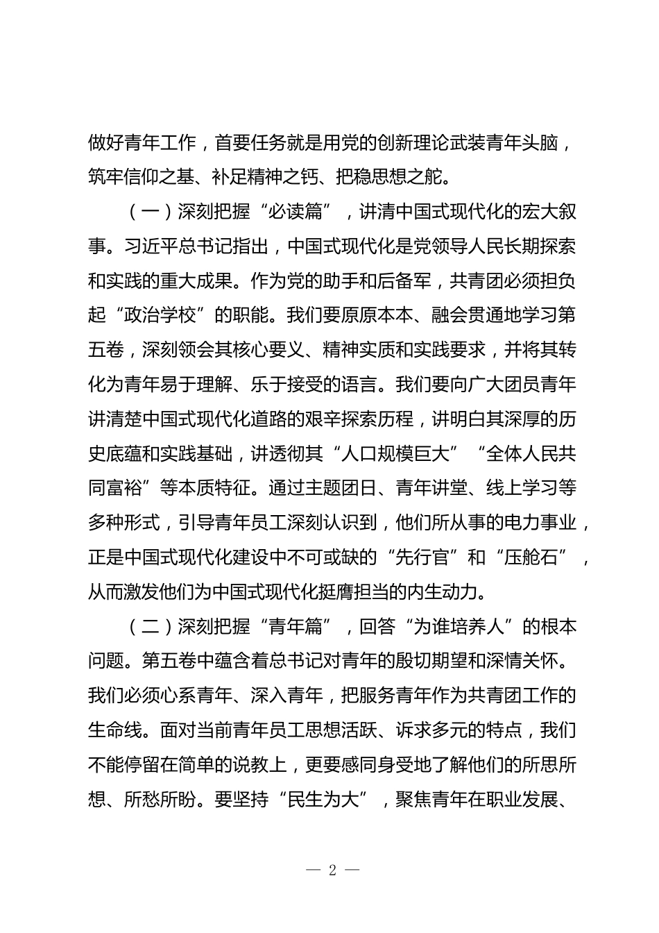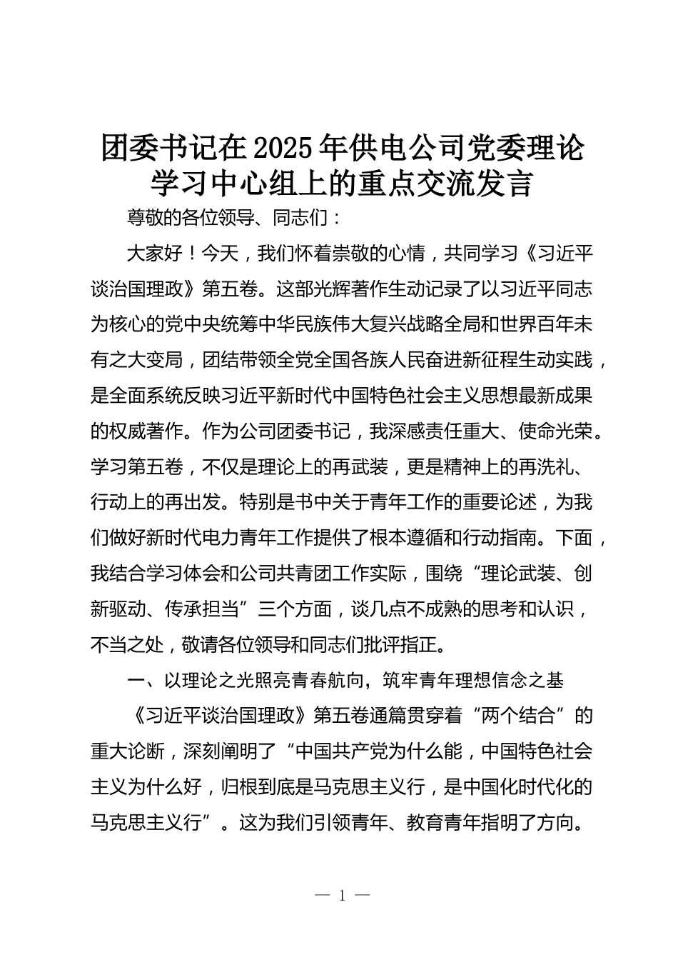 團(tuán)委書(shū)記在2025年供電公司黨委理論學(xué)習(xí)中心組上的重點(diǎn)交流發(fā)言尊敬的各位領(lǐng)導(dǎo)、同志們:大家好!今天,我們懷著崇敬的心情,共同學(xué)習(xí)《習(xí)近平談治國(guó)理政》第五卷。這部光輝著作生動(dòng)記錄了以習(xí)近平同志為核心的黨中央統(tǒng)籌中華民族偉大復(fù)興戰(zhàn)略全局和世界百年未有之大變局,團(tuán)結(jié)帶領(lǐng)全黨全國(guó)各族人民奮進(jìn)新征程生動(dòng)實(shí)踐,是全面系統(tǒng)反映習(xí)近平新時(shí)代中國(guó)特色社會(huì)主義思想最新成果的權(quán)威著作。作為公司團(tuán)委書(shū)記,我深感責(zé)任重大、使命光榮。學(xué)習(xí)第五卷,不僅是理論上的再武裝,更是精神上的再洗禮、行動(dòng)上的再出發(fā)。特別是書(shū)中關(guān)于青年工作的重要論述,為我們做好新時(shí)代電力...