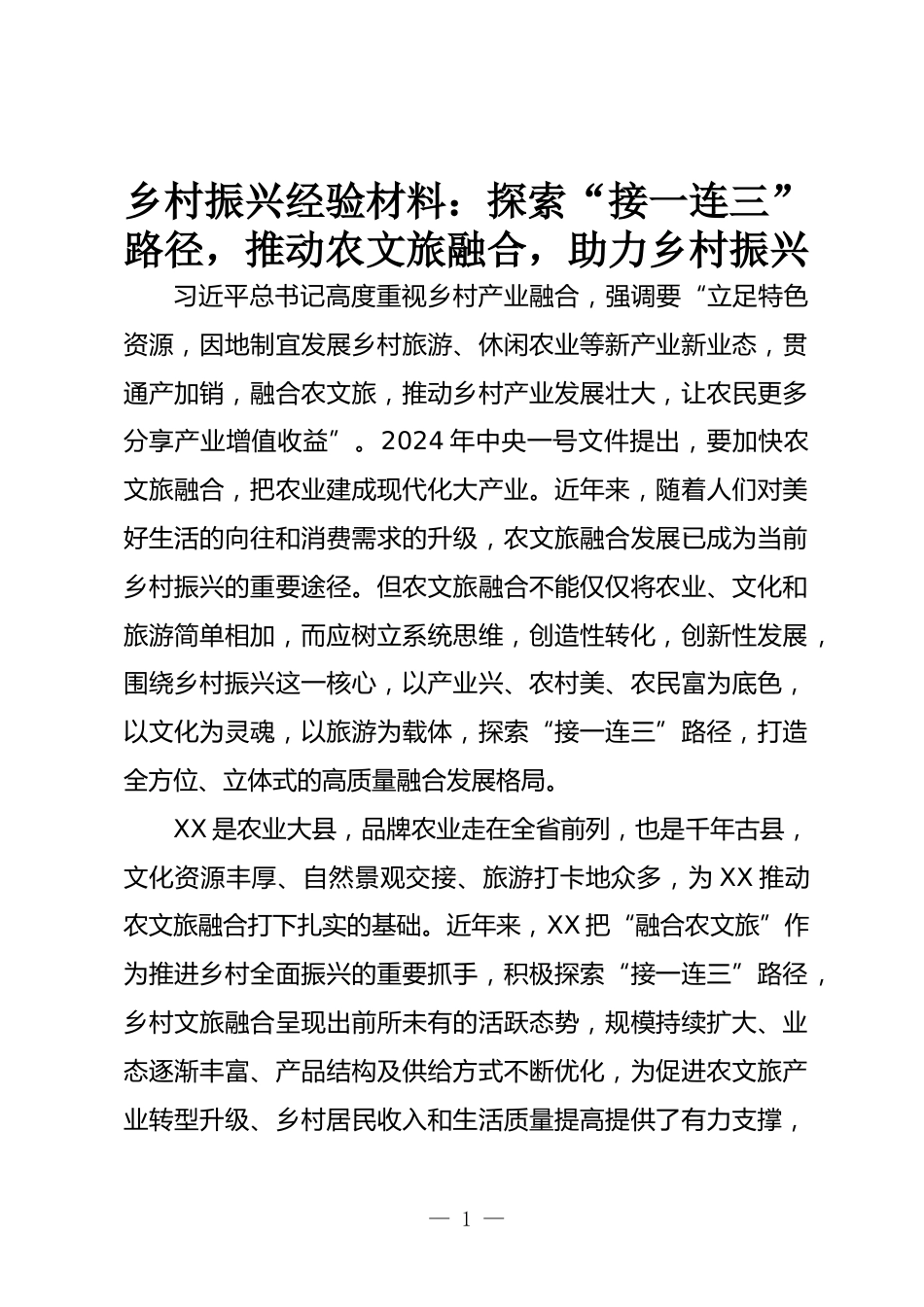 鄉(xiāng)村振興經(jīng)驗(yàn)材料:探索“接一連三”路徑,推動(dòng)農(nóng)文旅融合,助力鄉(xiāng)村振興習(xí)近平總書記高度重視鄉(xiāng)村產(chǎn)業(yè)融合,強(qiáng)調(diào)要“立足特色資源,因地制宜發(fā)展鄉(xiāng)村旅游、休閑農(nóng)業(yè)等新產(chǎn)業(yè)新業(yè)態(tài),貫通產(chǎn)加銷,融合農(nóng)文旅,推動(dòng)鄉(xiāng)村產(chǎn)業(yè)發(fā)展壯大,讓農(nóng)民更多分享產(chǎn)業(yè)增值收益”。2024年中央一號(hào)文件提出,要加快農(nóng)文旅融合,把農(nóng)業(yè)建成現(xiàn)代化大產(chǎn)業(yè)。近年來(lái),隨著人們對(duì)美好生活的向往和消費(fèi)需求的升級(jí),農(nóng)文旅融合發(fā)展已成為當(dāng)前鄉(xiāng)村振興的重要途徑。但農(nóng)文旅融合不能僅僅將農(nóng)業(yè)、文化和旅游簡(jiǎn)單相加,而應(yīng)樹立系統(tǒng)思維,創(chuàng)造性轉(zhuǎn)化,創(chuàng)新性發(fā)展,圍繞鄉(xiāng)村振興這一核心,以產(chǎn)業(yè)興、農(nóng)...
