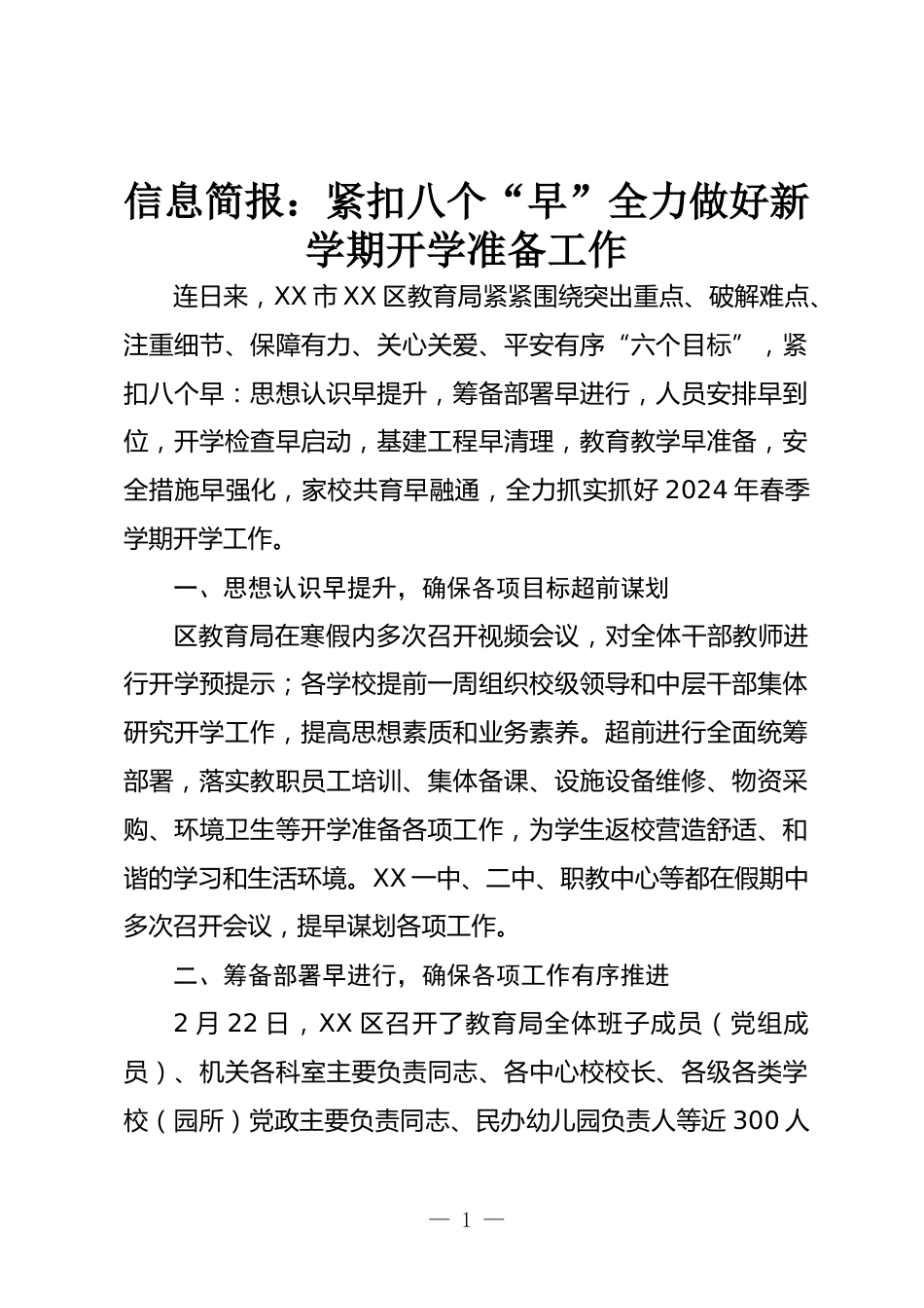 信息簡報:緊扣八個“早”全力做好新學期開學準備工作連日來,XX市XX區(qū)教育局緊緊圍繞突出重點、破解難點、注重細節(jié)、保障有力、關心關愛、平安有序“六個目標”,緊扣八個早:思想認識早提升,籌備部署早進行,人員安排早到位,開學檢查早啟動,基建工程早清理,教育教學早準備,安全措施早強化,家校共育早融通,全力抓實抓好2024年春季學期開學工作。一、思想認識早提升,確保各項目標超前謀劃區(qū)教育局在寒假內(nèi)多次召開視頻會議,對全體干部教師進行開學預提示;各學校提前一周組織校級領導和中層干部集體研究開學工作,提高思想素質(zhì)和業(yè)務素養(yǎng)。超前進行全面統(tǒng)籌部署...