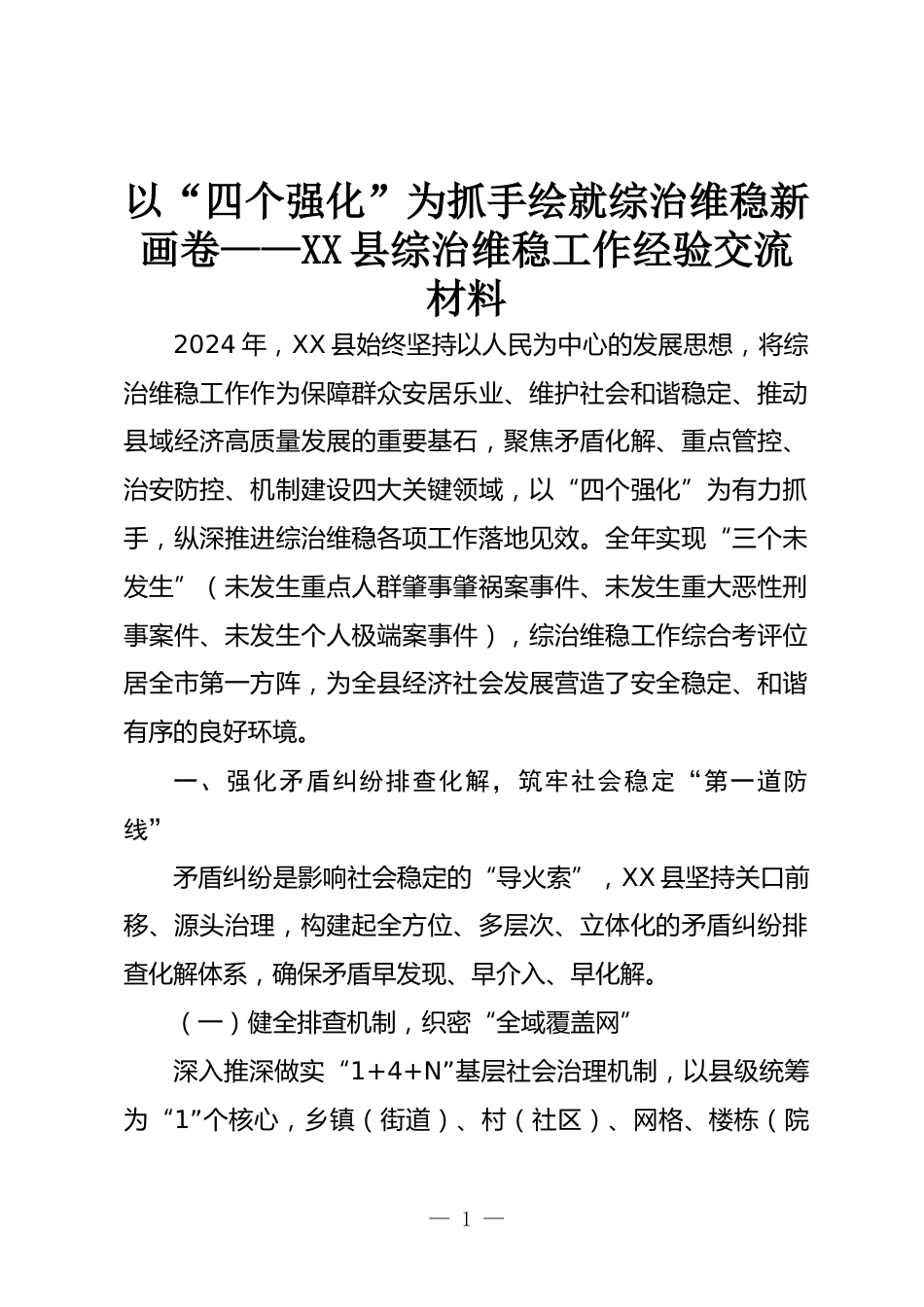以“四個強化”為抓手繪就綜治維穩(wěn)新畫卷——XX縣綜治維穩(wěn)工作經驗交流材料