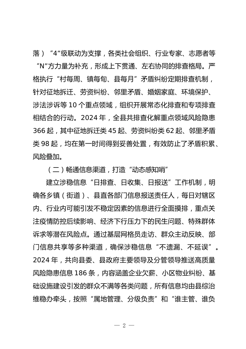 以“四個強化”為抓手繪就綜治維穩(wěn)新畫卷——XX縣綜治維穩(wěn)工作經驗交流材料2024年,XX縣始終堅持以人民為中心的發(fā)展思想,將綜治維穩(wěn)工作作為保障群眾安居樂業(yè)、維護社會和諧穩(wěn)定、推動縣域經濟高質量發(fā)展的重要基石,聚焦矛盾化解、重點管控、治安防控、機制建設四大關鍵領域,以“四個強化”為有力抓手,縱深推進綜治維穩(wěn)各項工作落地見效。全年實現(xiàn)“三個未發(fā)生”(未發(fā)生重點人群肇事肇禍案事件、未發(fā)生重大惡性刑事案件、未發(fā)生個人極端案事件),綜治維穩(wěn)工作綜合考評位居全市第一方陣,為全縣經濟社會發(fā)展營造了安全穩(wěn)定、和諧有序的良好環(huán)境。一、強化矛盾糾紛排...