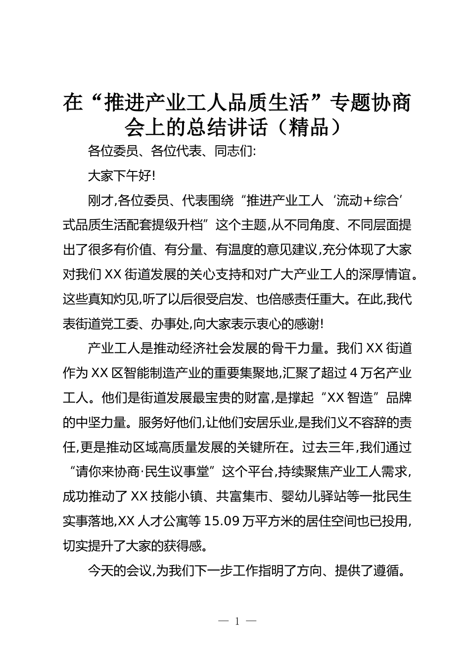 在“推進產(chǎn)業(yè)工人品質(zhì)生活”專題協(xié)商會上的總結(jié)講話(精品)