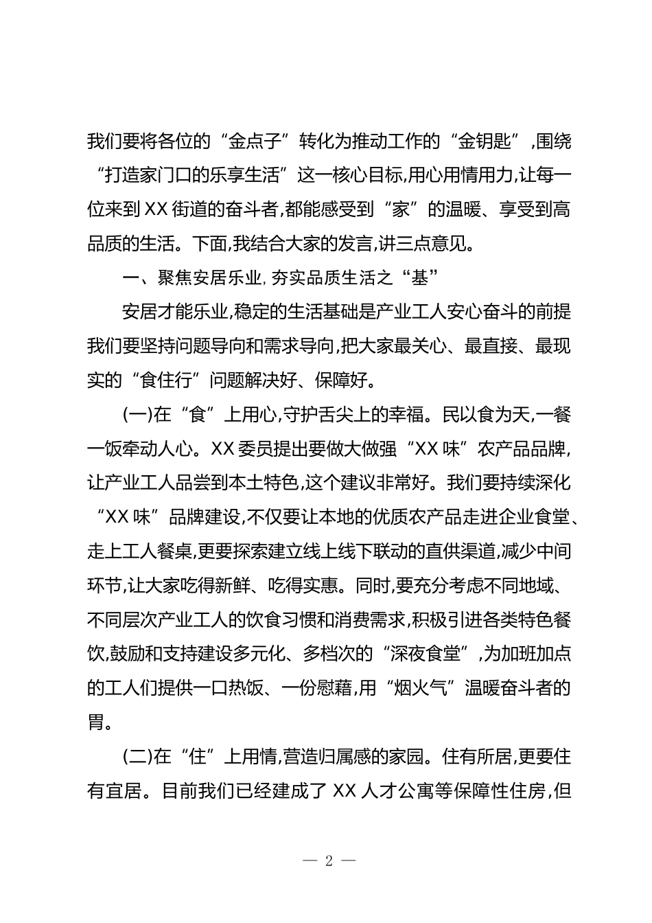 在“推進產(chǎn)業(yè)工人品質(zhì)生活”專題協(xié)商會上的總結(jié)講話(精品)各位委員、各位代表、同志們:大家下午好!剛才,各位委員、代表圍繞“推進產(chǎn)業(yè)工人‘流動+綜合’式品質(zhì)生活配套提級升檔”這個主題,從不同角度、不同層面提出了很多有價值、有分量、有溫度的意見建議,充分體現(xiàn)了大家對我們XX街道發(fā)展的關心支持和對廣大產(chǎn)業(yè)工人的深厚情誼。這些真知灼見,聽了以后很受啟發(fā)、也倍感責任重大。在此,我代表街道黨工委、辦事處,向大家表示衷心的感謝!產(chǎn)業(yè)工人是推動經(jīng)濟社會發(fā)展的骨干力量。我們XX街道作為XX區(qū)智能制造產(chǎn)業(yè)的重要集聚地,匯聚了超過4萬名產(chǎn)業(yè)工人。他們是街道發(fā)展最寶...