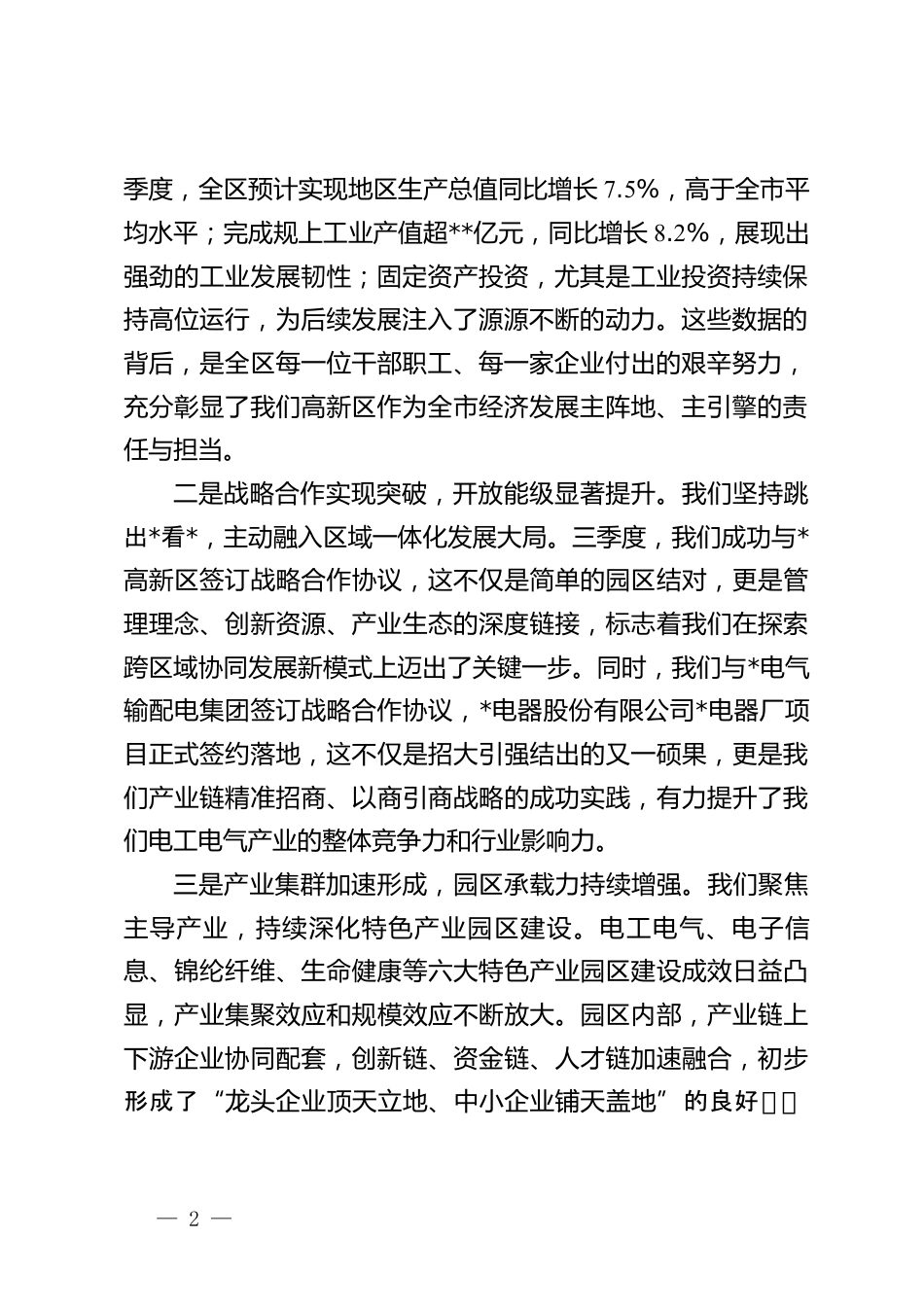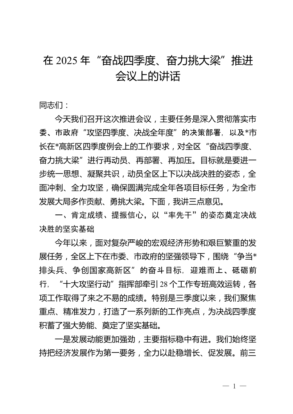 在2025年“奮戰(zhàn)四季度、奮力挑大梁”推進(jìn)會議上的講話同志們:今天我們召開這次推進(jìn)會議,主要任務(wù)是深入貫徹落實(shí)市委、市政府“攻堅(jiān)四季度、決戰(zhàn)全年度”的決策部署,以及*市長在*高新區(qū)四季度例會上的工作要求,對全區(qū)“奮戰(zhàn)四季度、奮力挑大梁”進(jìn)行再動員、再部署、再加壓。目標(biāo)就是要進(jìn)一步統(tǒng)一思想、凝聚共識,動員全區(qū)上下以決戰(zhàn)決勝的姿態(tài),全面沖刺、全力攻堅(jiān),確保圓滿完成全年各項(xiàng)目標(biāo)任務(wù),為全市發(fā)展大局多作貢獻(xiàn)、勇挑大梁。下面,我講三點(diǎn)意見。一、肯定成績、提振信心,以“率先干”的姿態(tài)奠定決戰(zhàn)決勝的堅(jiān)實(shí)基礎(chǔ)今年以來,面對復(fù)雜嚴(yán)峻的宏觀經(jīng)濟(jì)形勢和...