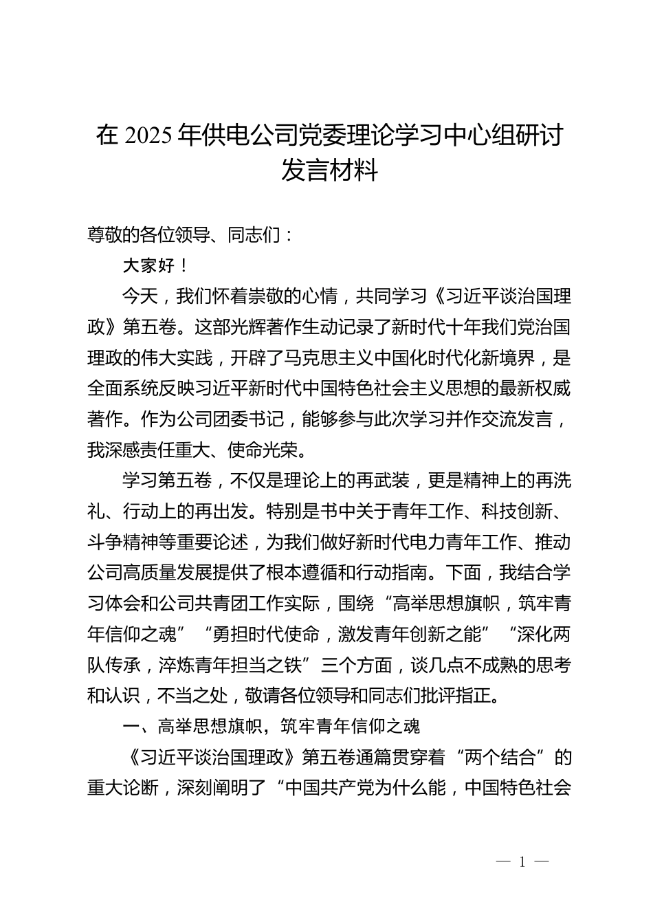 在2025年供電公司黨委理論學(xué)習(xí)中心組研討發(fā)言材料尊敬的各位領(lǐng)導(dǎo)、同志們:大家好!今天,我們懷著崇敬的心情,共同學(xué)習(xí)《習(xí)近平談治國(guó)理政》第五卷。這部光輝著作生動(dòng)記錄了新時(shí)代十年我們黨治國(guó)理政的偉大實(shí)踐,開辟了馬克思主義中國(guó)化時(shí)代化新境界,是全面系統(tǒng)反映習(xí)近平新時(shí)代中國(guó)特色社會(huì)主義思想的最新權(quán)威著作。作為公司團(tuán)委書記,能夠參與此次學(xué)習(xí)并作交流發(fā)言,我深感責(zé)任重大、使命光榮。學(xué)習(xí)第五卷,不僅是理論上的再武裝,更是精神上的再洗禮、行動(dòng)上的再出發(fā)。特別是書中關(guān)于青年工作、科技創(chuàng)新、斗爭(zhēng)精神等重要論述,為我們做好新時(shí)代電力青年工作、推動(dòng)公...