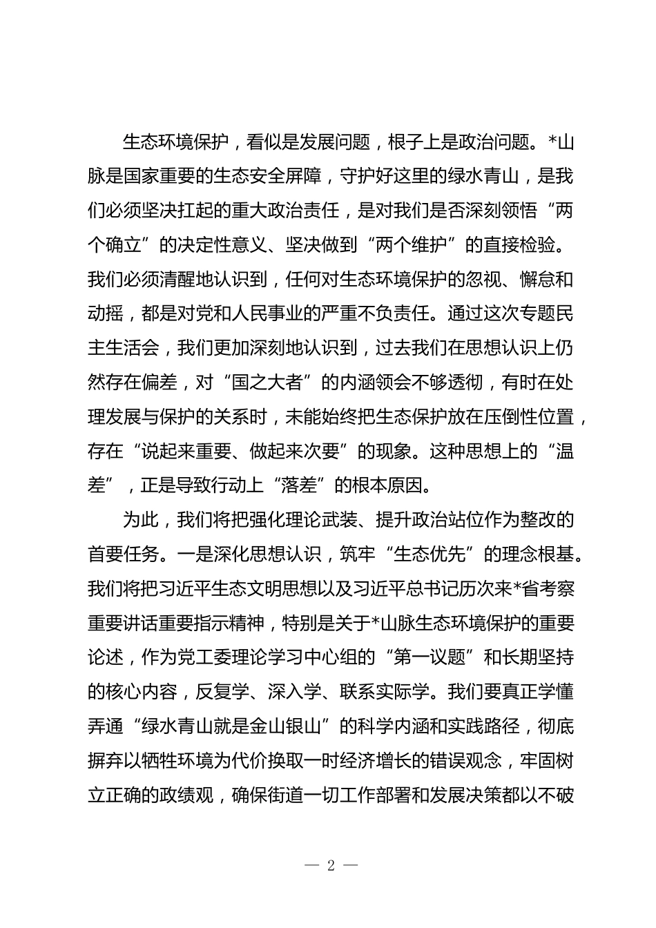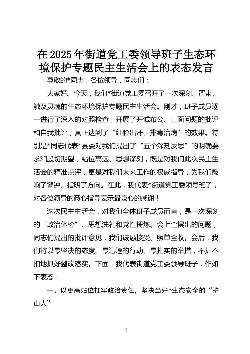 在2025年街道黨工委領(lǐng)導(dǎo)班子生態(tài)環(huán)境保護(hù)專題民主生活會上的表態(tài)發(fā)言