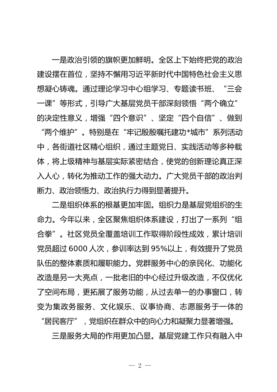 在2025年全區(qū)街道基層黨建工作推進(jìn)會(huì)上的講話同志們:今天,我們?cè)诖苏匍_(kāi)全區(qū)街道基層黨建工作現(xiàn)場(chǎng)觀摩暨推進(jìn)會(huì)。剛才,大家一起實(shí)地觀摩了*街道*社區(qū)的黨建工作,聽(tīng)取了他們的經(jīng)驗(yàn)介紹,感受很深,啟發(fā)也很大。*社區(qū)將黨建工作與社區(qū)治理、服務(wù)群眾深度融合,做到了有聲有色、有形有效,值得各單位學(xué)習(xí)借鑒。召開(kāi)這次會(huì)議,主要目的是總結(jié)今年以來(lái)全區(qū)街道基層黨建工作的成效,分析當(dāng)前面臨的新形勢(shì)新問(wèn)題,并對(duì)下一階段的重點(diǎn)任務(wù)進(jìn)行再動(dòng)員、再部署。根據(jù)工委的安排,下面我講三點(diǎn)意見(jiàn)。一、肯定成績(jī),正視過(guò)往,在砥礪奮進(jìn)中夯實(shí)基層治理根基今年以來(lái),全區(qū)各街道黨...
