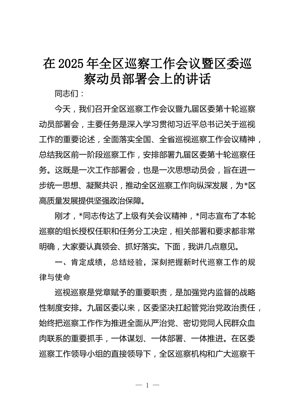 在2025年全區(qū)巡察工作會議暨區(qū)委巡察動員部署會上的講話