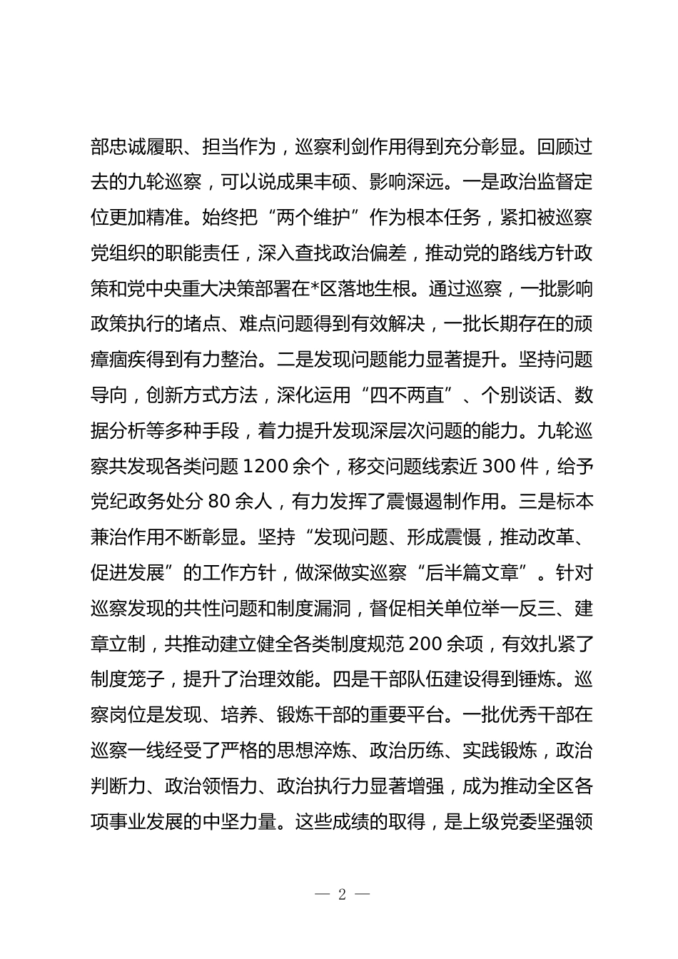 在2025年全區(qū)巡察工作會議暨區(qū)委巡察動員部署會上的講話同志們:今天,我們召開全區(qū)巡察工作會議暨九屆區(qū)委第十輪巡察動員部署會,主要任務是深入學習貫徹習近平總書記關于巡視工作的重要論述,全面落實全國、全省巡視巡察工作會議精神,總結我區(qū)前一階段巡察工作,安排部署九屆區(qū)委第十輪巡察任務。這既是一次工作部署會,也是一次思想動員會,旨在進一步統(tǒng)一思想、凝聚共識,推動全區(qū)巡察工作向縱深發(fā)展,為*區(qū)高質量發(fā)展提供堅強政治保障。剛才,*同志傳達了上級有關會議精神,*同志宣布了本輪巡察的組長授權任職和任務分工決定,相關部署和要求都非常明確,大家要認...