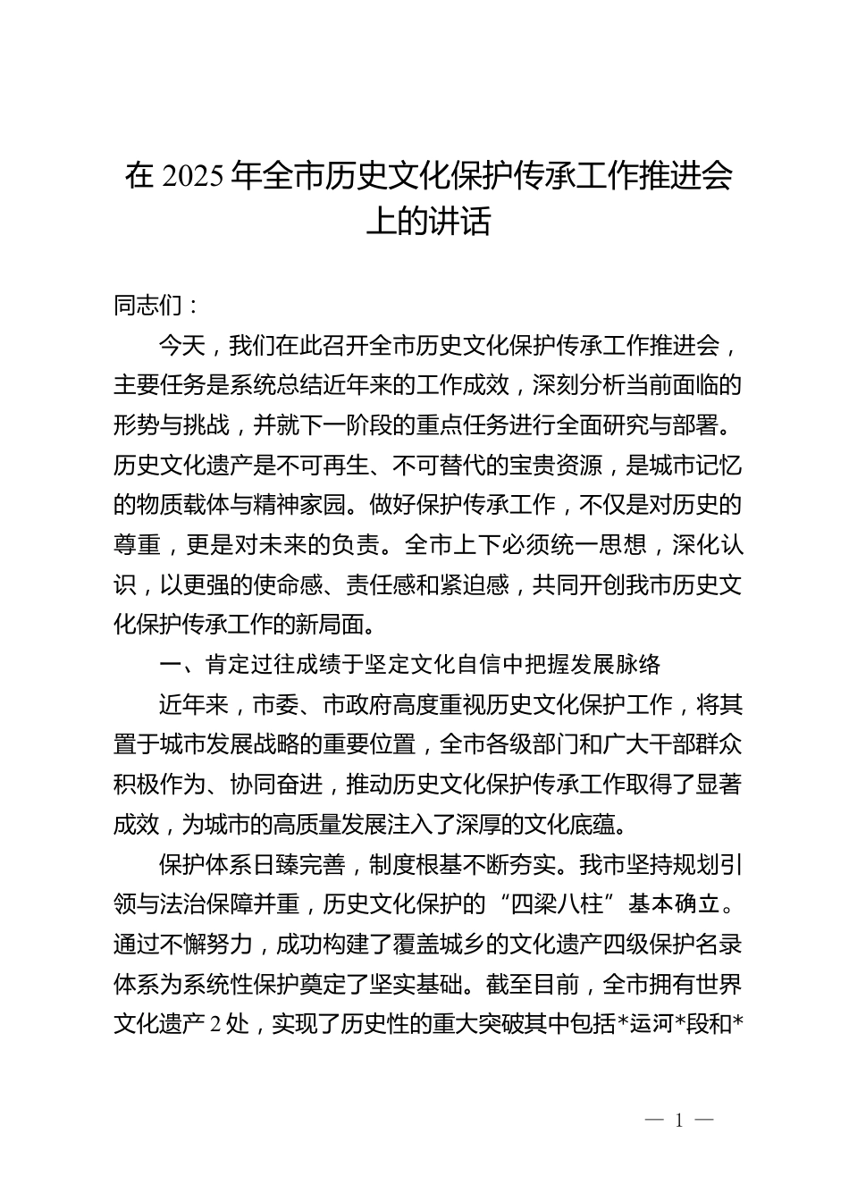 在2025年全市歷史文化保護(hù)傳承工作推進(jìn)會上的講話