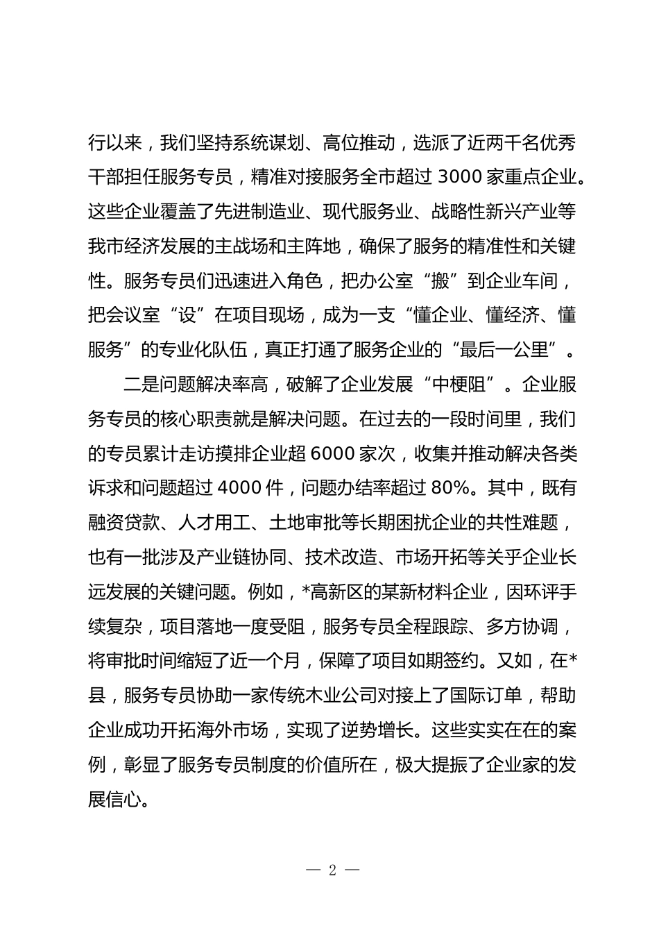 在2025年全市深化企業(yè)服務專員工作推進會上的講話同志們:今天,我們在這里召開全市深化企業(yè)服務專員工作推進會主要任務是總結(jié)前期工作成效,分析當前面臨的新形勢、新要求,安排部署下一階段重點任務,推動企業(yè)服務專員工作向縱深發(fā)展,為我市經(jīng)濟社會高質(zhì)量發(fā)展注入更加強勁的動力。剛才,市經(jīng)信局的同志匯報了首批企業(yè)服務專員的工作成效并作了具體部署,*區(qū)的同志分享了寶貴經(jīng)驗,市委組織部的*同志提出了明確要求,內(nèi)容都很翔實,指導性很強,希望大家認真領(lǐng)會,抓好落實。下面,我講幾點意見。一、肯定成績,總結(jié)經(jīng)驗,深刻認識企業(yè)服務專員工作的重大意義優(yōu)化營商...