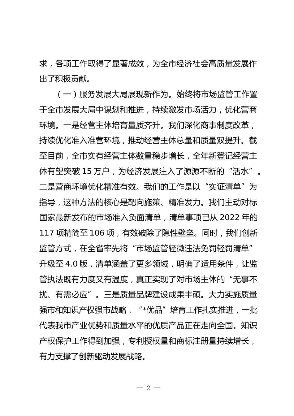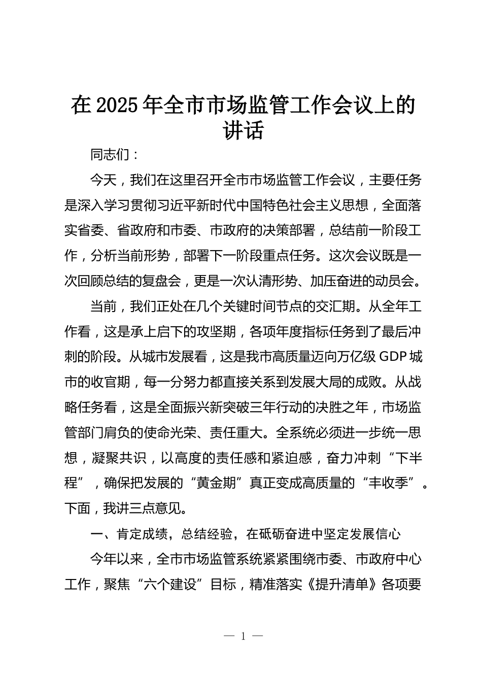 在2025年全市市場(chǎng)監(jiān)管工作會(huì)議上的講話同志們:今天,我們?cè)谶@里召開(kāi)全市市場(chǎng)監(jiān)管工作會(huì)議,主要任務(wù)是深入學(xué)習(xí)貫徹習(xí)近平新時(shí)代中國(guó)特色社會(huì)主義思想,全面落實(shí)省委、省政府和市委、市政府的決策部署,總結(jié)前一階段工作,分析當(dāng)前形勢(shì),部署下一階段重點(diǎn)任務(wù)。這次會(huì)議既是一次回顧總結(jié)的復(fù)盤會(huì),更是一次認(rèn)清形勢(shì)、加壓奮進(jìn)的動(dòng)員會(huì)。當(dāng)前,我們正處在幾個(gè)關(guān)鍵時(shí)間節(jié)點(diǎn)的交匯期。從全年工作看,這是承上啟下的攻堅(jiān)期,各項(xiàng)年度指標(biāo)任務(wù)到了最后沖刺的階段。從城市發(fā)展看,這是我市高質(zhì)量邁向萬(wàn)億級(jí)GDP城市的收官期,每一分努力都直接關(guān)系到發(fā)展大局的成敗。從戰(zhàn)略任務(wù)...