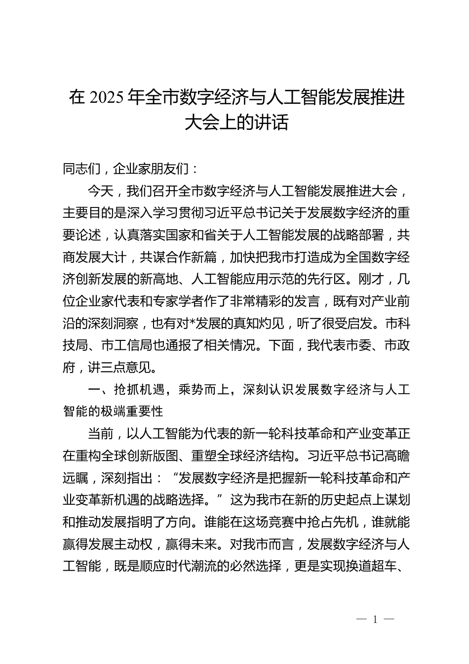 在2025年全市數(shù)字經(jīng)濟與人工智能發(fā)展推進大會上的講話同志們,企業(yè)家朋友們:今天,我們召開全市數(shù)字經(jīng)濟與人工智能發(fā)展推進大會,主要目的是深入學習貫徹習近平總書記關(guān)于發(fā)展數(shù)字經(jīng)濟的重要論述,認真落實國家和省關(guān)于人工智能發(fā)展的戰(zhàn)略部署,共商發(fā)展大計,共謀合作新篇,加快把我市打造成為全國數(shù)字經(jīng)濟創(chuàng)新發(fā)展的新高地、人工智能應(yīng)用示范的先行區(qū)。剛才,幾位企業(yè)家代表和專家學者作了非常精彩的發(fā)言,既有對產(chǎn)業(yè)前沿的深刻洞察,也有對*發(fā)展的真知灼見,聽了很受啟發(fā)。市科技局、市工信局也通報了相關(guān)情況。下面,我代表市委、市政府,講三點意見。一、搶抓機遇...