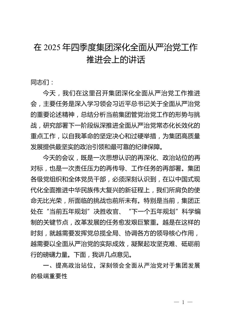 在2025年四季度集團深化全面從嚴治黨工作推進會上的講話