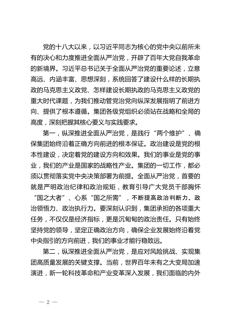 在2025年四季度集團深化全面從嚴治黨工作推進會上的講話同志們:今天,我們在這里召開集團深化全面從嚴治黨工作推進會,主要任務是深入學習領會習近平總書記關于全面從嚴治黨的重要論述精神,總結分析當前集團管黨治黨工作的形勢與挑戰(zhàn),研究部署下一階段縱深推進全面從嚴治黨常態(tài)化長效化的重點工作,以自我革命的堅定決心和過硬舉措,為集團高質量發(fā)展提供最堅實的政治引領和最可靠的紀律保障。今天的會議,既是一次思想認識的再深化、政治站位的再對標,也是一次責任壓力的再傳導、工作任務的再部署。集團各級黨組織和全體黨員干部,必須深刻認識到,在以中國式現(xiàn)代化...