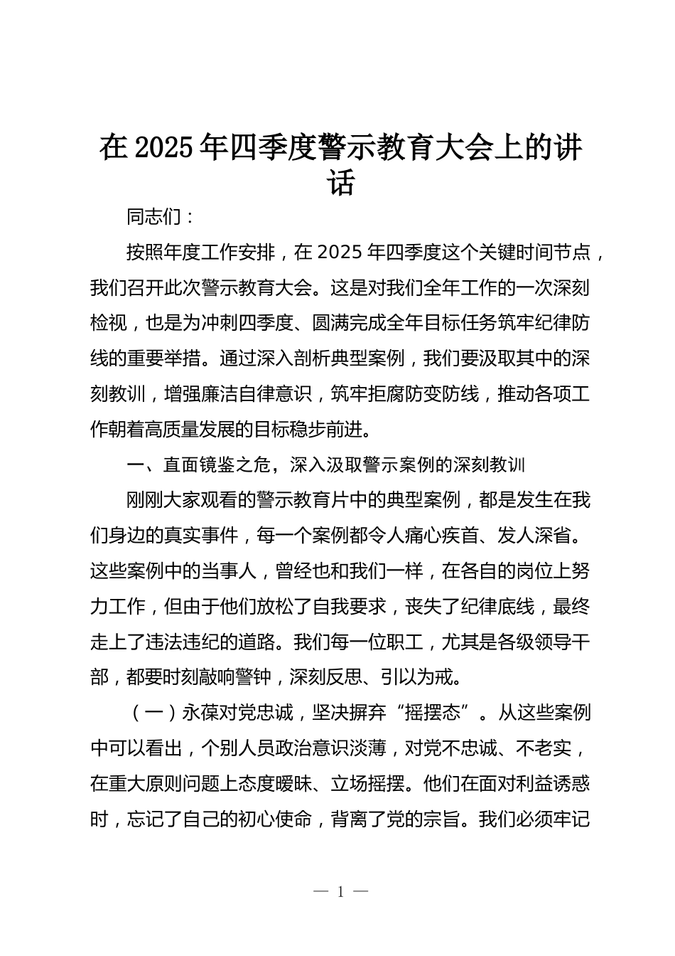 在2025年四季度警示教育大會上的講話同志們:按照年度工作安排,在2025年四季度這個關鍵時間節(jié)點,我們召開此次警示教育大會。這是對我們?nèi)旯ぷ鞯囊淮紊羁虣z視,也是為沖刺四季度、圓滿完成全年目標任務筑牢紀律防線的重要舉措。通過深入剖析典型案例,我們要汲取其中的深刻教訓,增強廉潔自律意識,筑牢拒腐防變防線,推動各項工作朝著高質(zhì)量發(fā)展的目標穩(wěn)步前進。一、直面鏡鑒之危,深入汲取警示案例的深刻教訓剛剛大家觀看的警示教育片中的典型案例,都是發(fā)生在我們身邊的真實事件,每一個案例都令人痛心疾首、發(fā)人深省。這些案例中的當事人,曾經(jīng)也和我們一樣,在各...