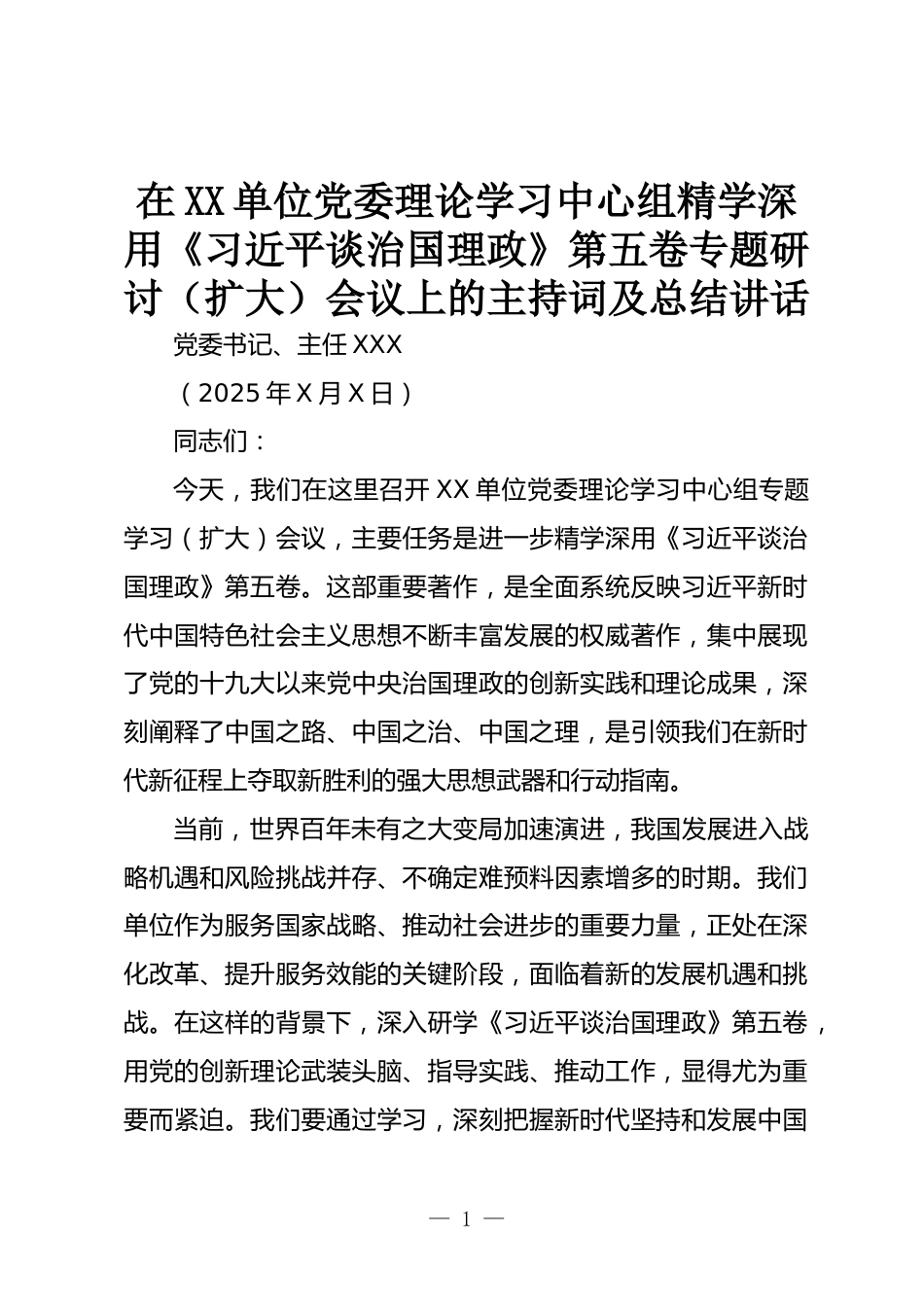 在XX單位黨委理論學(xué)習(xí)中心組精學(xué)深用《習(xí)近平談治國(guó)理政》第五卷專題研討(擴(kuò)大)會(huì)議上的主持詞及總結(jié)講話?