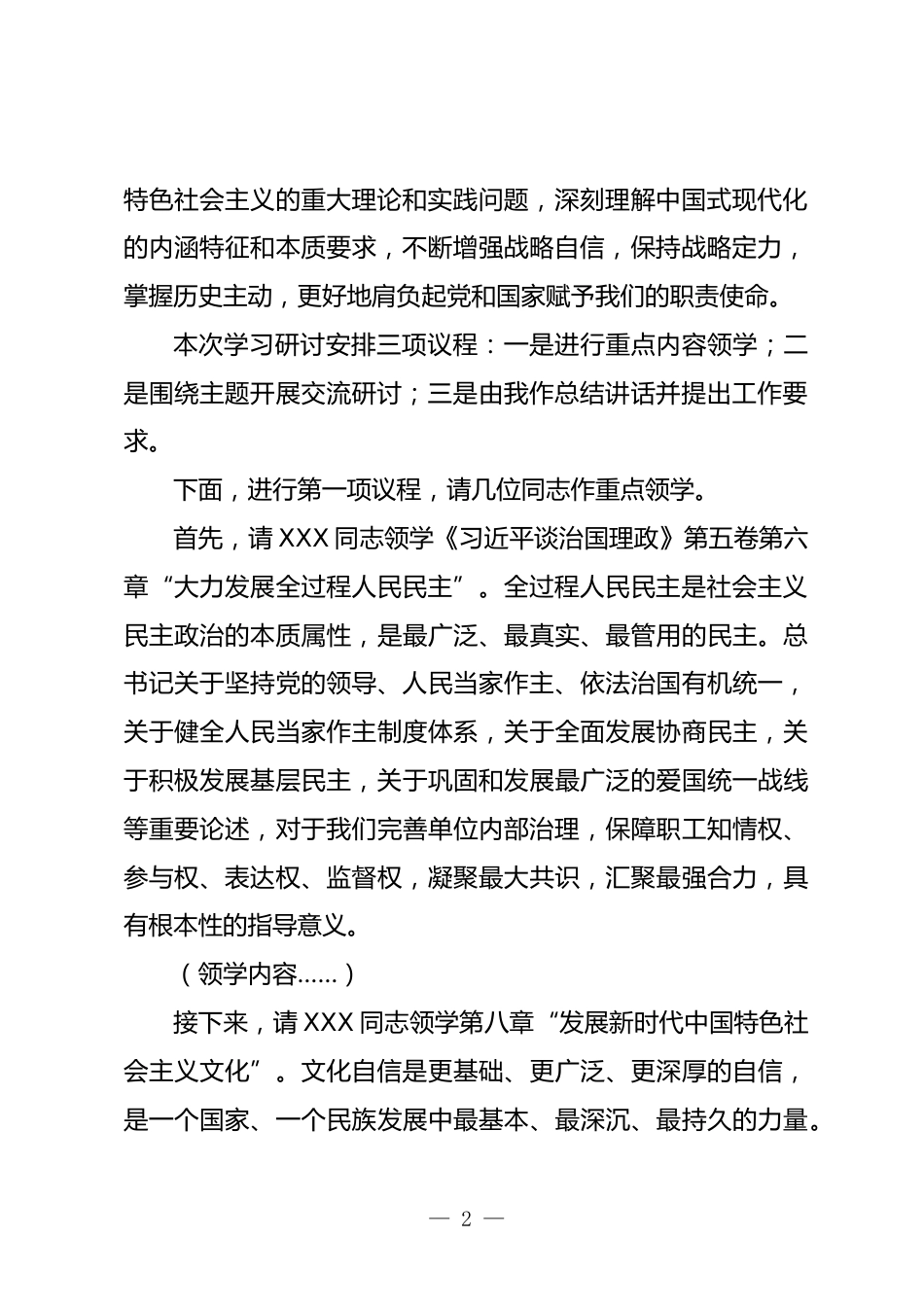 在XX單位黨委理論學(xué)習(xí)中心組精學(xué)深用《習(xí)近平談治國(guó)理政》第五卷專題研討(擴(kuò)大)會(huì)議上的主持詞及總結(jié)講話黨委書(shū)記、主任XXX(2025年X月X日)同志們:今天,我們?cè)谶@里召開(kāi)XX單位黨委理論學(xué)習(xí)中心組專題學(xué)習(xí)(擴(kuò)大)會(huì)議,主要任務(wù)是進(jìn)一步精學(xué)深用《習(xí)近平談治國(guó)理政》第五卷。這部重要著作,是全面系統(tǒng)反映習(xí)近平新時(shí)代中國(guó)特色社會(huì)主義思想不斷豐富發(fā)展的權(quán)威著作,集中展現(xiàn)了黨的十九大以來(lái)黨中央治國(guó)理政的創(chuàng)新實(shí)踐和理論成果,深刻闡釋了中國(guó)之路、中國(guó)之治、中國(guó)之理,是引領(lǐng)我們?cè)谛聲r(shí)代新征程上奪取新勝利的強(qiáng)大思想武器和行動(dòng)指南。當(dāng)前,世界百年未有之大變...
