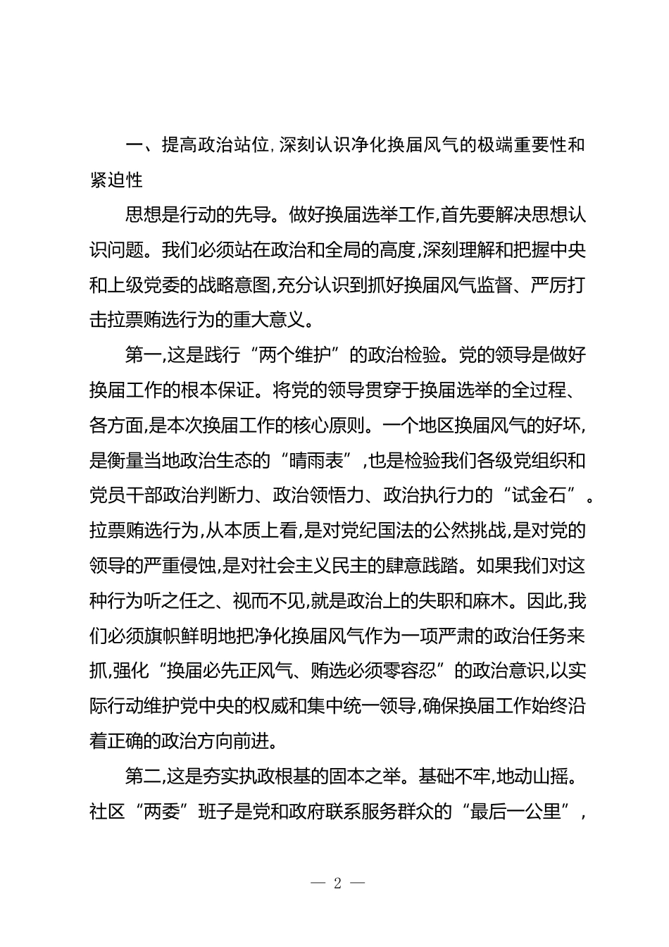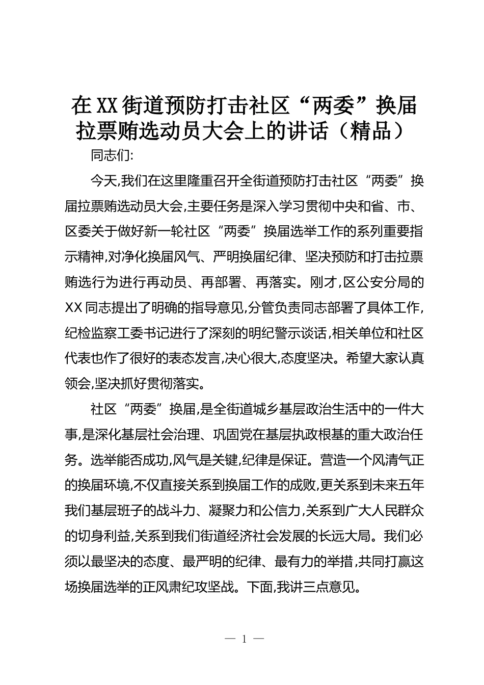 在XX街道預(yù)防打擊社區(qū)“兩委”換屆拉票賄選動(dòng)員大會(huì)上的講話(精品)同志們:今天,我們?cè)谶@里隆重召開全街道預(yù)防打擊社區(qū)“兩委”換屆拉票賄選動(dòng)員大會(huì),主要任務(wù)是深入學(xué)習(xí)貫徹中央和省、市、區(qū)委關(guān)于做好新一輪社區(qū)“兩委”換屆選舉工作的系列重要指示精神,對(duì)凈化換屆風(fēng)氣、嚴(yán)明換屆紀(jì)律、堅(jiān)決預(yù)防和打擊拉票賄選行為進(jìn)行再動(dòng)員、再部署、再落實(shí)。剛才,區(qū)公安分局的XX同志提出了明確的指導(dǎo)意見,分管負(fù)責(zé)同志部署了具體工作,紀(jì)檢監(jiān)察工委書記進(jìn)行了深刻的明紀(jì)警示談話,相關(guān)單位和社區(qū)代表也作了很好的表態(tài)發(fā)言,決心很大,態(tài)度堅(jiān)決。希望大家認(rèn)真領(lǐng)會(huì),堅(jiān)決抓好貫徹落實(shí)。社...