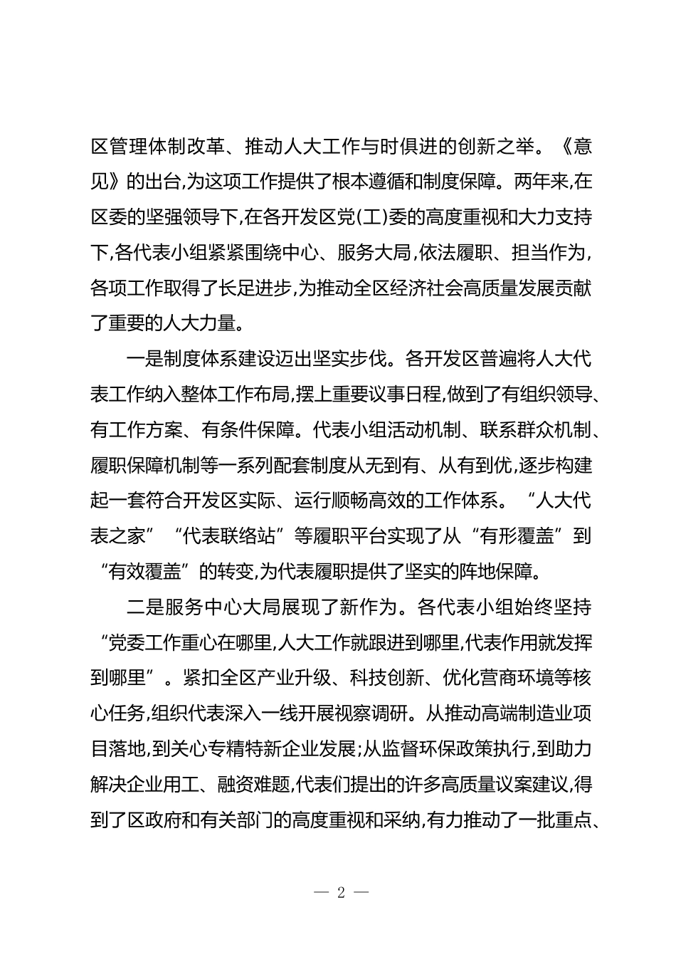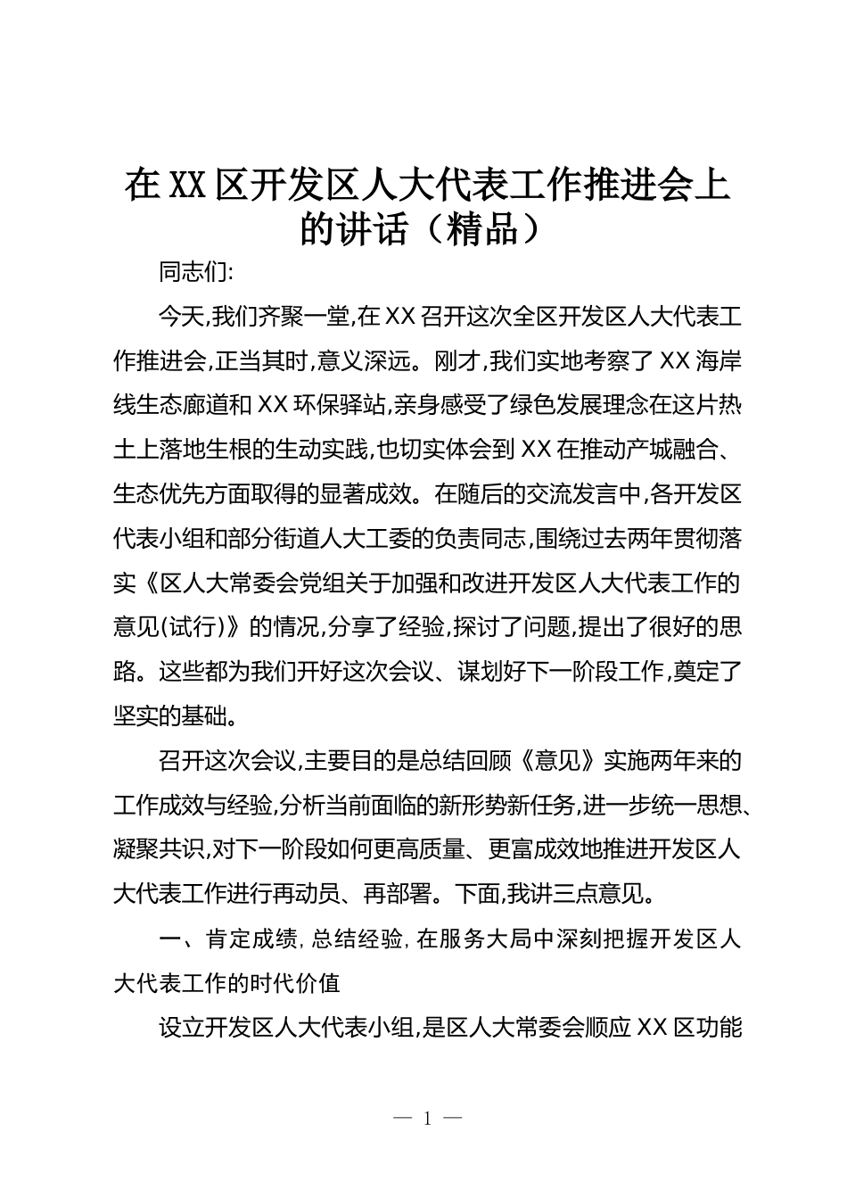 在XX區(qū)開發(fā)區(qū)人大代表工作推進會上的講話(精品)同志們:今天,我們齊聚一堂,在XX召開這次全區(qū)開發(fā)區(qū)人大代表工作推進會,正當其時,意義深遠。剛才,我們實地考察了XX海岸線生態(tài)廊道和XX環(huán)保驛站,親身感受了綠色發(fā)展理念在這片熱土上落地生根的生動實踐,也切實體會到XX在推動產(chǎn)城融合、生態(tài)優(yōu)先方面取得的顯著成效。在隨后的交流發(fā)言中,各開發(fā)區(qū)代表小組和部分街道人大工委的負責同志,圍繞過去兩年貫徹落實《區(qū)人大常委會黨組關于加強和改進開發(fā)區(qū)人大代表工作的意見(試行)》的情況,分享了經(jīng)驗,探討了問題,提出了很好的思路。這些都為我們開好這次會議、謀劃好下一階段工作,...