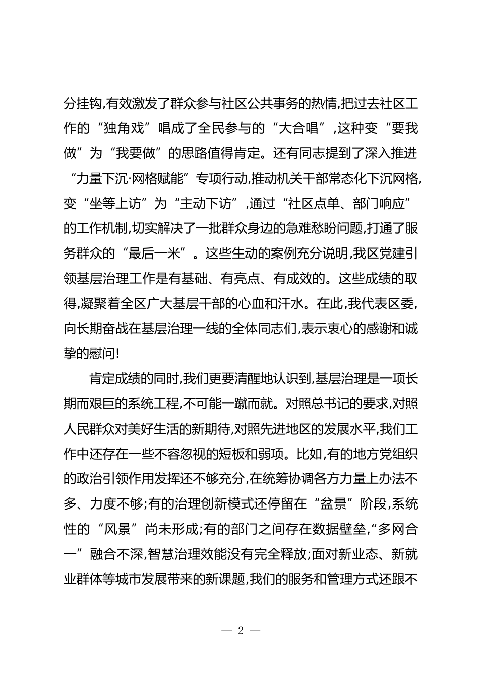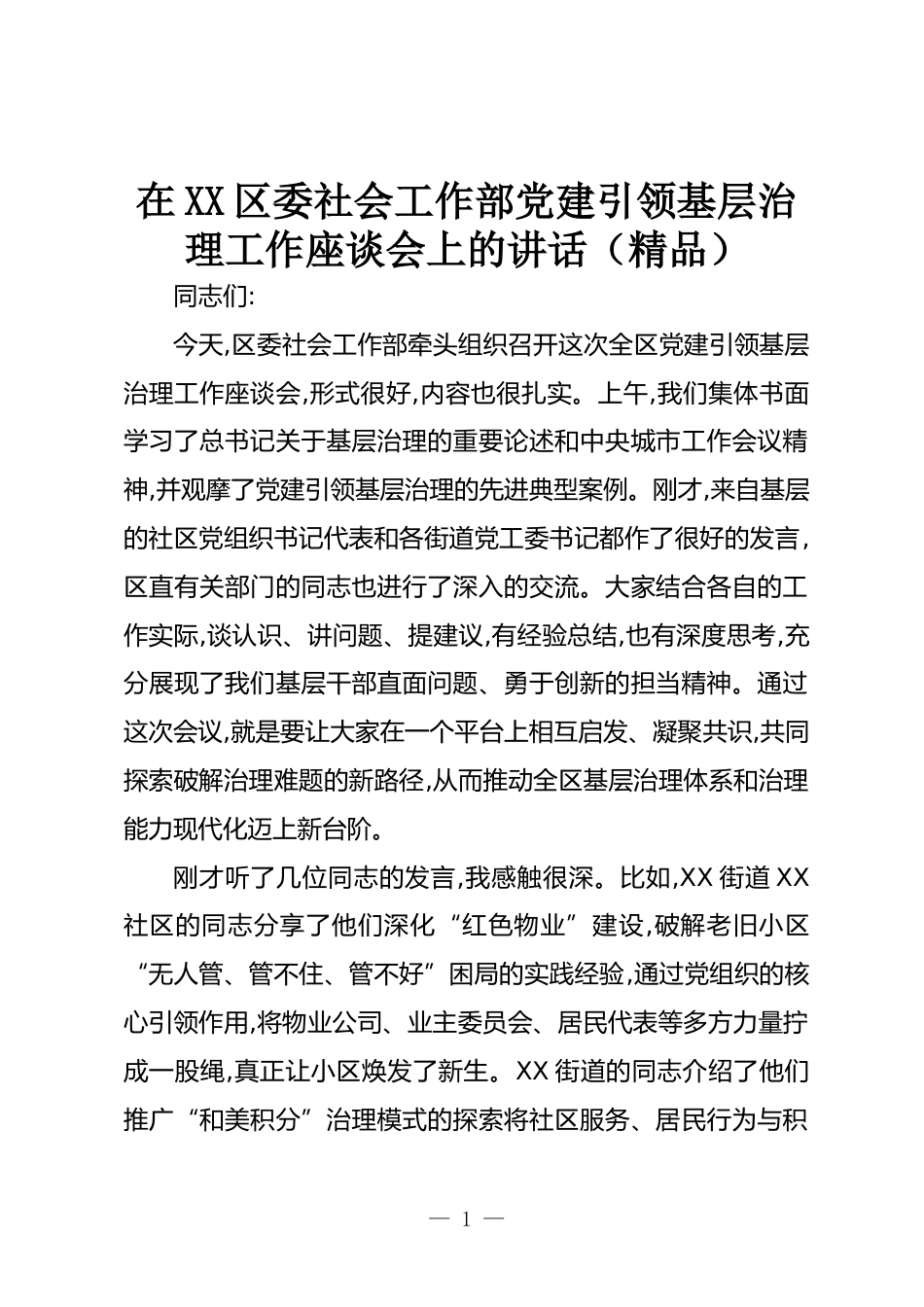 在XX區(qū)委社會工作部黨建引領基層治理工作座談會上的講話(精品)同志們:今天,區(qū)委社會工作部牽頭組織召開這次全區(qū)黨建引領基層治理工作座談會,形式很好,內(nèi)容也很扎實。上午,我們集體書面學習了總書記關于基層治理的重要論述和中央城市工作會議精神,并觀摩了黨建引領基層治理的先進典型案例。剛才,來自基層的社區(qū)黨組織書記代表和各街道黨工委書記都作了很好的發(fā)言,區(qū)直有關部門的同志也進行了深入的交流。大家結合各自的工作實際,談認識、講問題、提建議,有經(jīng)驗總結,也有深度思考,充分展現(xiàn)了我們基層干部直面問題、勇于創(chuàng)新的擔當精神。通過這次會議,就是要讓大家在一個...
