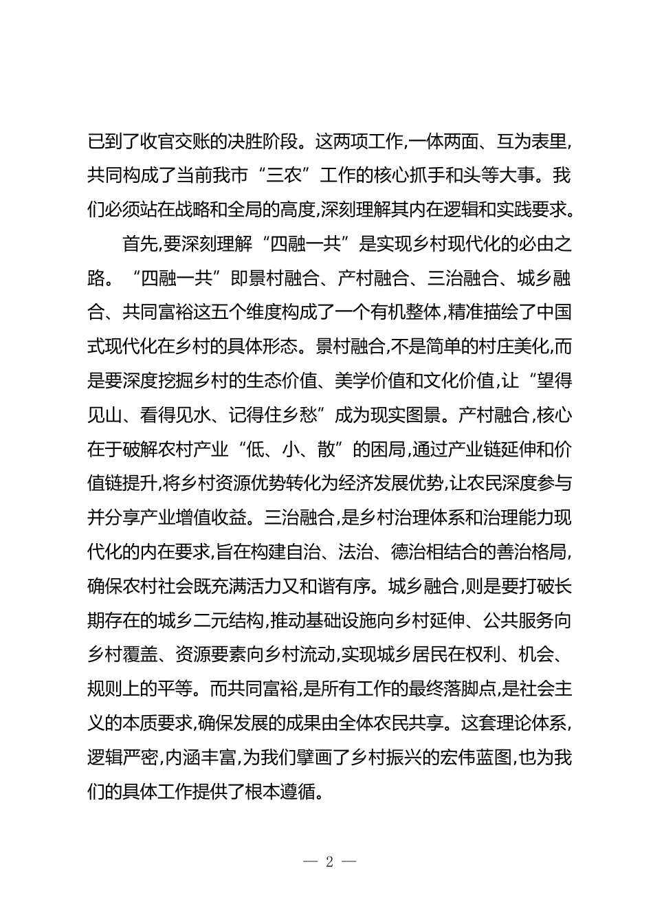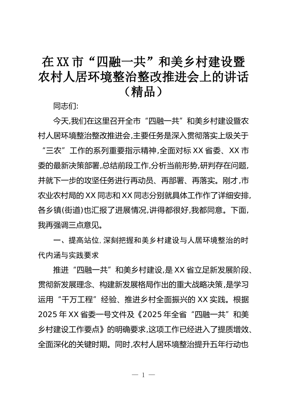 在XX市“四融一共”和美鄉(xiāng)村建設(shè)暨農(nóng)村人居環(huán)境整治整改推進(jìn)會上的講話(精品)同志們:今天,我們在這里召開全市“四融一共”和美鄉(xiāng)村建設(shè)暨農(nóng)村人居環(huán)境整治整改推進(jìn)會,主要任務(wù)是深入貫徹落實(shí)上級關(guān)于“三農(nóng)”工作的系列重要指示精神,全面對標(biāo)XX省委、XX市委的最新決策部署,總結(jié)前段工作,分析當(dāng)前形勢,研判存在問題,并就下一步的攻堅(jiān)任務(wù)進(jìn)行再動員、再部署、再落實(shí)。剛才,市農(nóng)業(yè)農(nóng)村局的XX同志和XX同志分別就具體工作作了詳細(xì)安排,各鄉(xiāng)鎮(zhèn)(街道)也匯報(bào)了進(jìn)展情況,講得都很好,我都同意。下面,我再強(qiáng)調(diào)三點(diǎn)意見。一、提高站位,深刻把握和美鄉(xiāng)村建設(shè)與人居環(huán)境整治的時(shí)代內(nèi)...