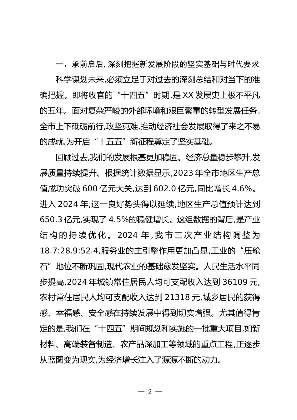 在XX市專(zhuān)題研究“十五五”規(guī)劃工作會(huì)議上的講話(huà)(精品)1同志們:今天,我們召開(kāi)這次專(zhuān)題會(huì)議,核心議題是研究和謀劃我市的“十五五”發(fā)展規(guī)劃。昨天,我們聽(tīng)取了咨詢(xún)機(jī)構(gòu)對(duì)規(guī)劃綱要主要內(nèi)容的介紹,也聆聽(tīng)了多位省級(jí)專(zhuān)家學(xué)者的真知灼見(jiàn),相關(guān)部門(mén)的負(fù)責(zé)同志也結(jié)合工作實(shí)際提出了很好的意見(jiàn)建議。這充分體現(xiàn)了大家對(duì)XX未來(lái)五年發(fā)展的高度責(zé)任感和使命感。“十五五”時(shí)期,是XX在全面振興新突破的堅(jiān)實(shí)基礎(chǔ)上,實(shí)現(xiàn)更高質(zhì)量、更可持續(xù)發(fā)展的關(guān)鍵五年,也是推進(jìn)中國(guó)式現(xiàn)代化XX實(shí)踐的攻堅(jiān)時(shí)期。科學(xué)編制并實(shí)施好“十五五”規(guī)劃,就是為未來(lái)五年乃至更長(zhǎng)時(shí)期的發(fā)展繪制一份清晰的路線圖...